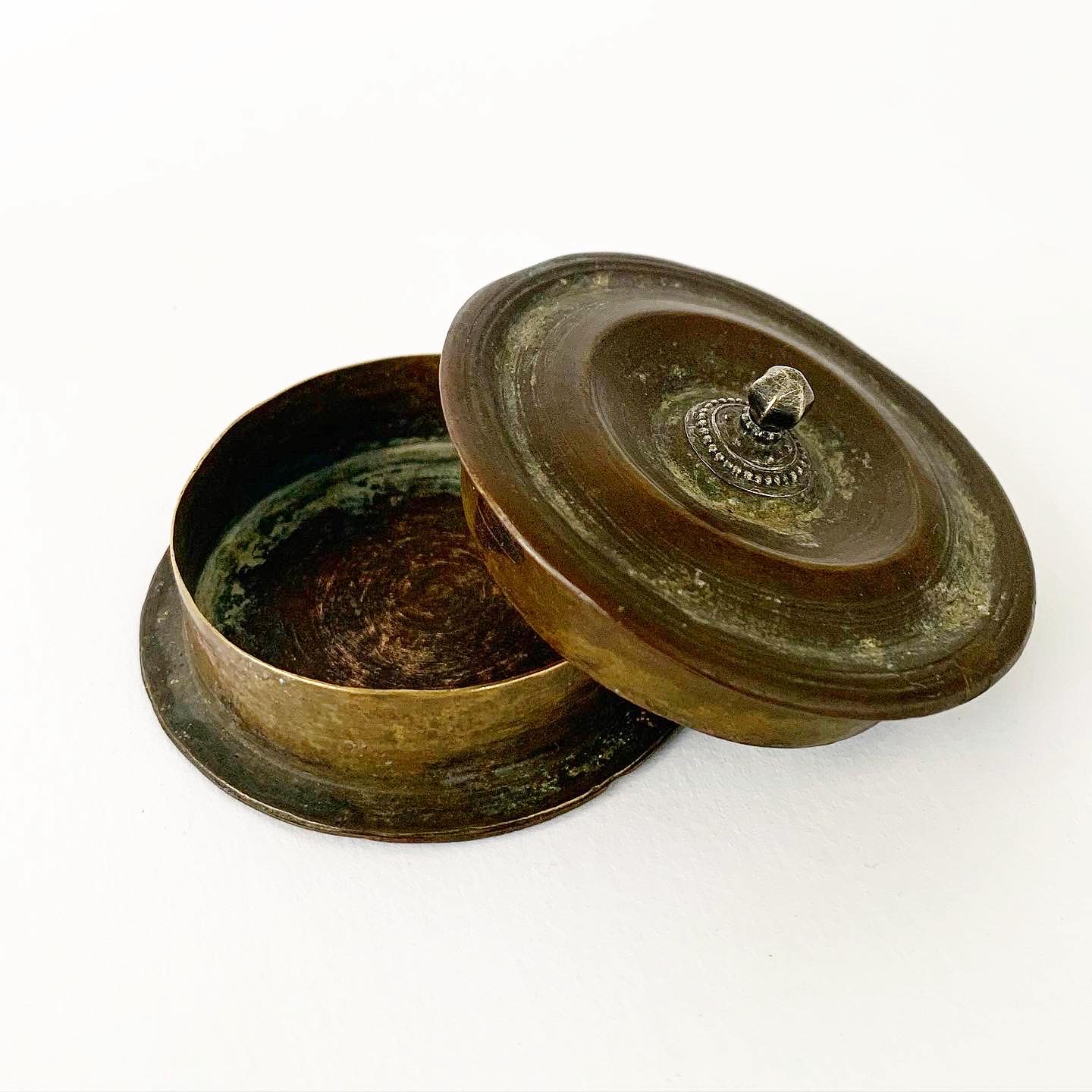 A beautiful small copper box with silver handle which dates back to the mid 19th century. Possibly from Tibet or Ladakh. There are remnants of sandalwood paste on the inside of the box so this may have been once used by a priest or holy man.