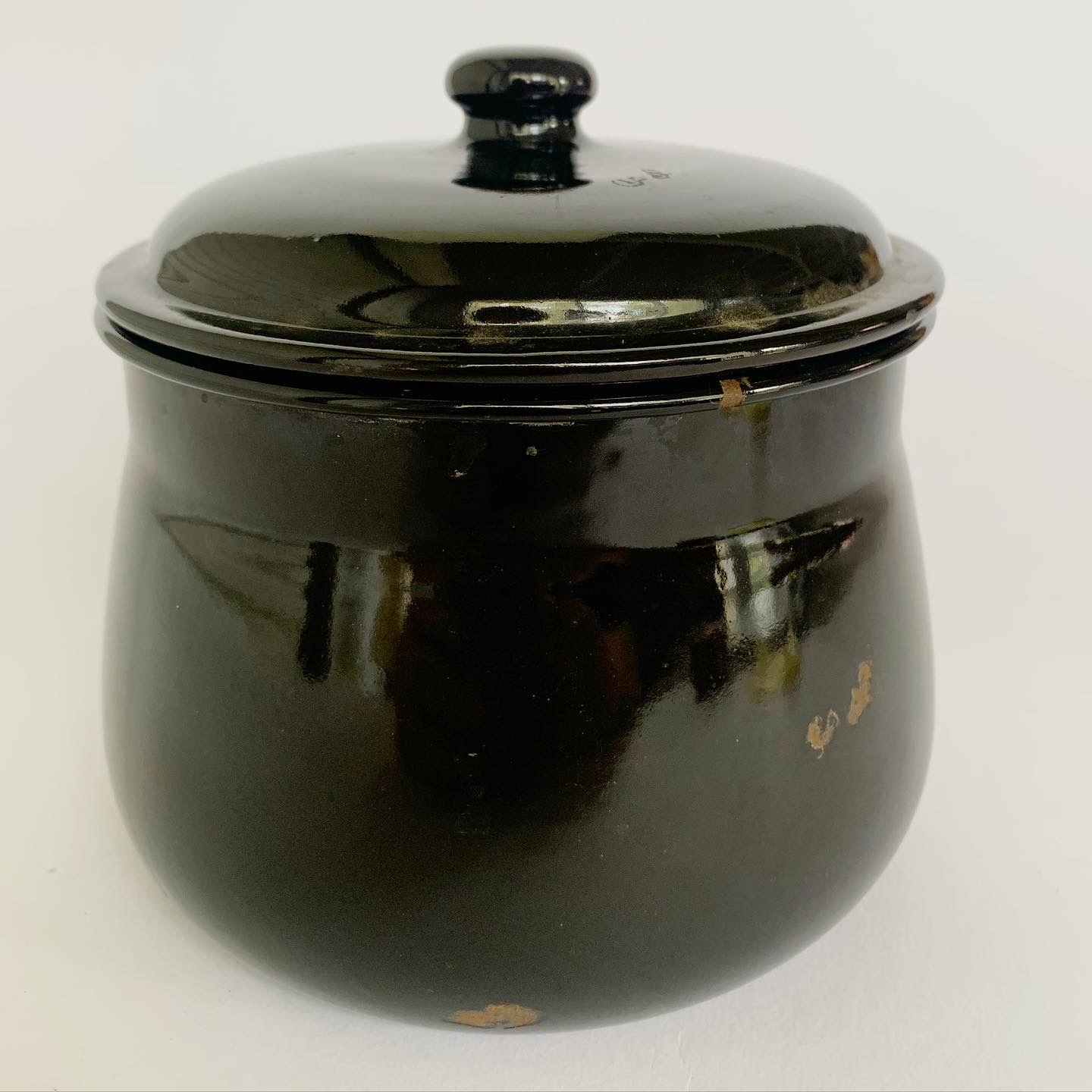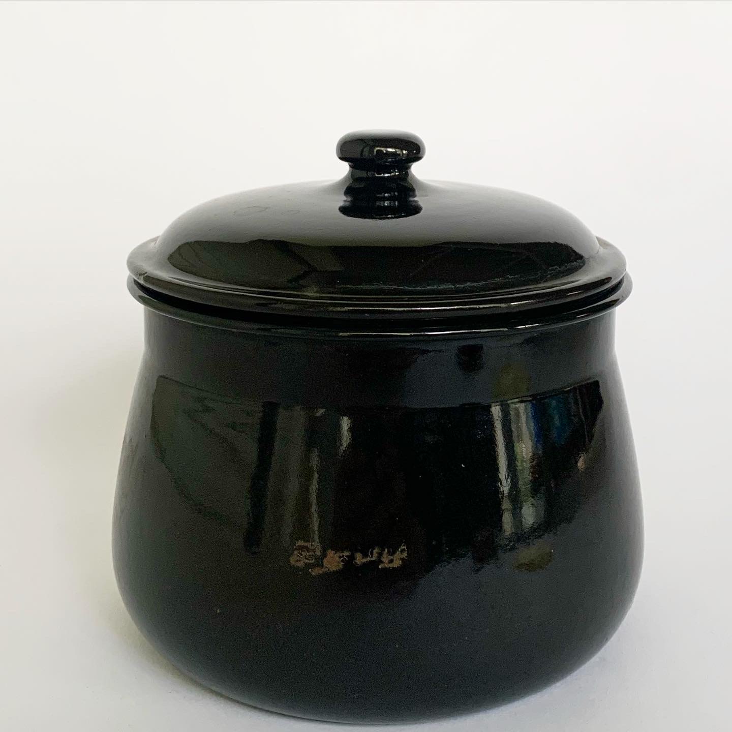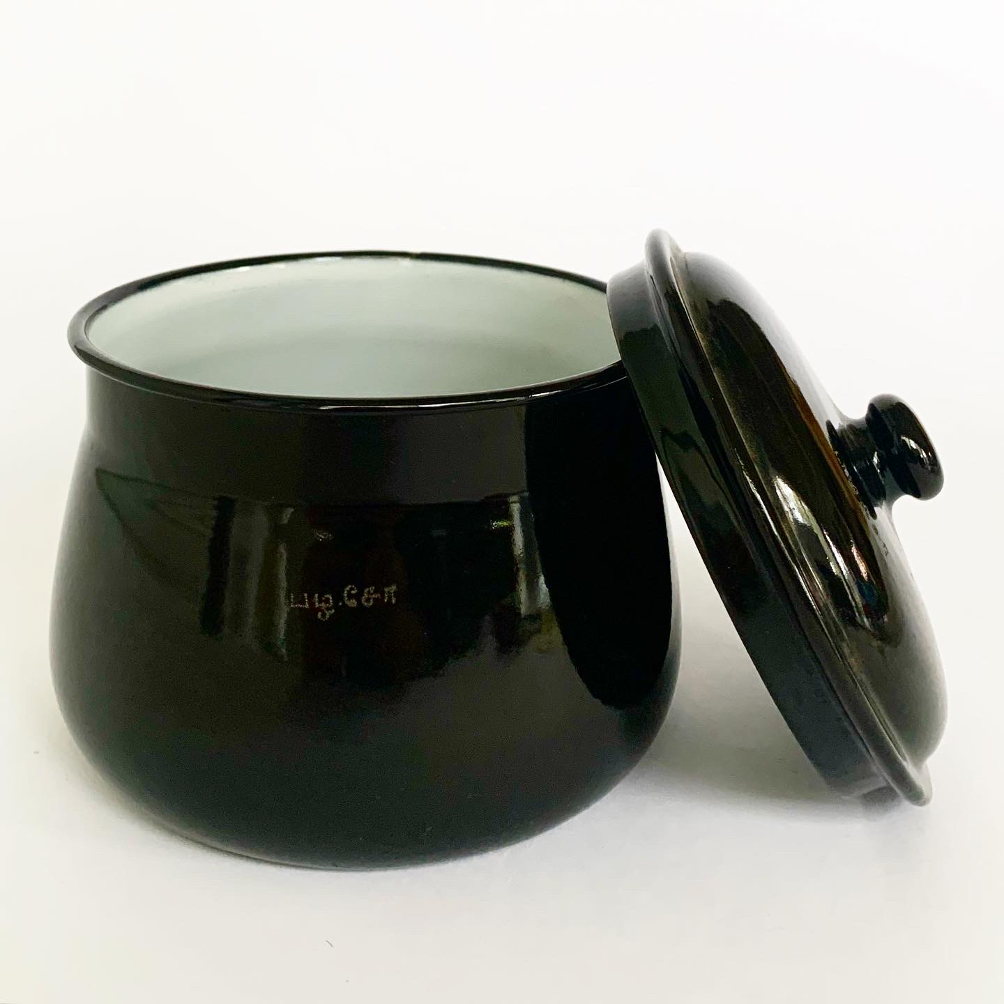 Black, “Judge”, enamelware container with lid, from the 1930s/40s, sourced in Chettinad, Tamil Nadu, South India. The lid is the same black underneath, and the interior of the base is white enamel. The British brand of Judge Cookware was manufactured by Ernest Stevens Limited in Cradley Heath, Staffordshire in England. The company was founded in 1890 and closed in the 1960s.