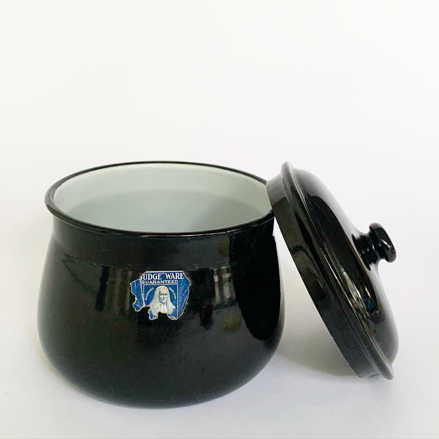 Black, “Judge”, enamelware container with lid from the 1930s/40s, sourced in Chettinad, Tamil Nadu, South India. The lid is the same black underneath, and the interior of the base is white enamel. The British brand of Judge Cookware was manufactured by Ernest Stevens Limited in Cradley Heath, Staffordshire in England. The company was founded in 1890 and closed in the 1960s. The original brand sticker remains, both on the side and on the base with the illustrated logo of a judge, showing the piece has hardly been used.