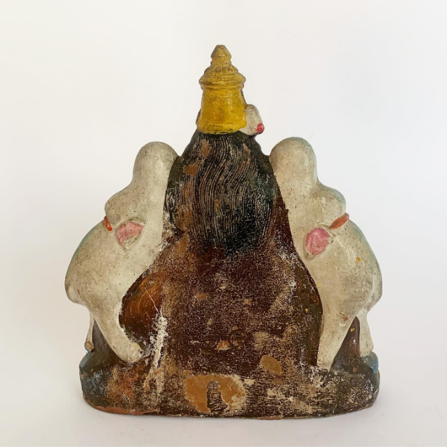 Vintage terracotta bommai of Gajalakshmi from Tamil Nadu from the 1940s. Lakshmi, who is married to Vishnu, is the goddess of wealth, fortune, love, beauty, joy and prosperity. Gajalakshmi, means Lakshmi with elephants (gaja), the elephants are on either side of her, raisng their trunks to garland Lakshmi. This aspect is representative of prosperity, good luck, and abundance. Lakshmi is seated on a lotus pedestal and in each of her upper hands carries a lotus, while the lower hands are shown in specific mudras (symbolic hand gestures) one in abhya (without fear) and the other in varadamudra (dispensing boons/wishes). Many shopkeepers and businesspeople worship her at the start of each day hoping for prosperity. In some states of India Gajalakshmi is also worshiped as a fertility goddess.