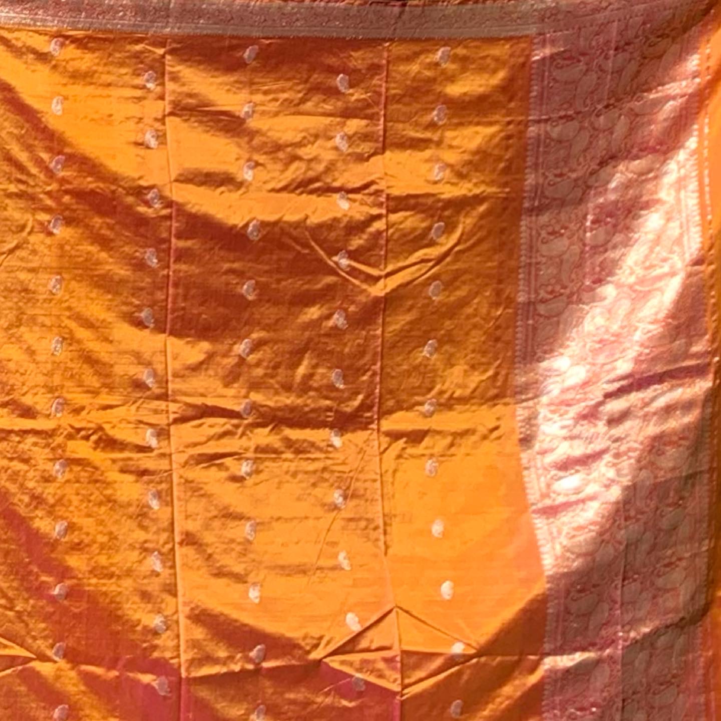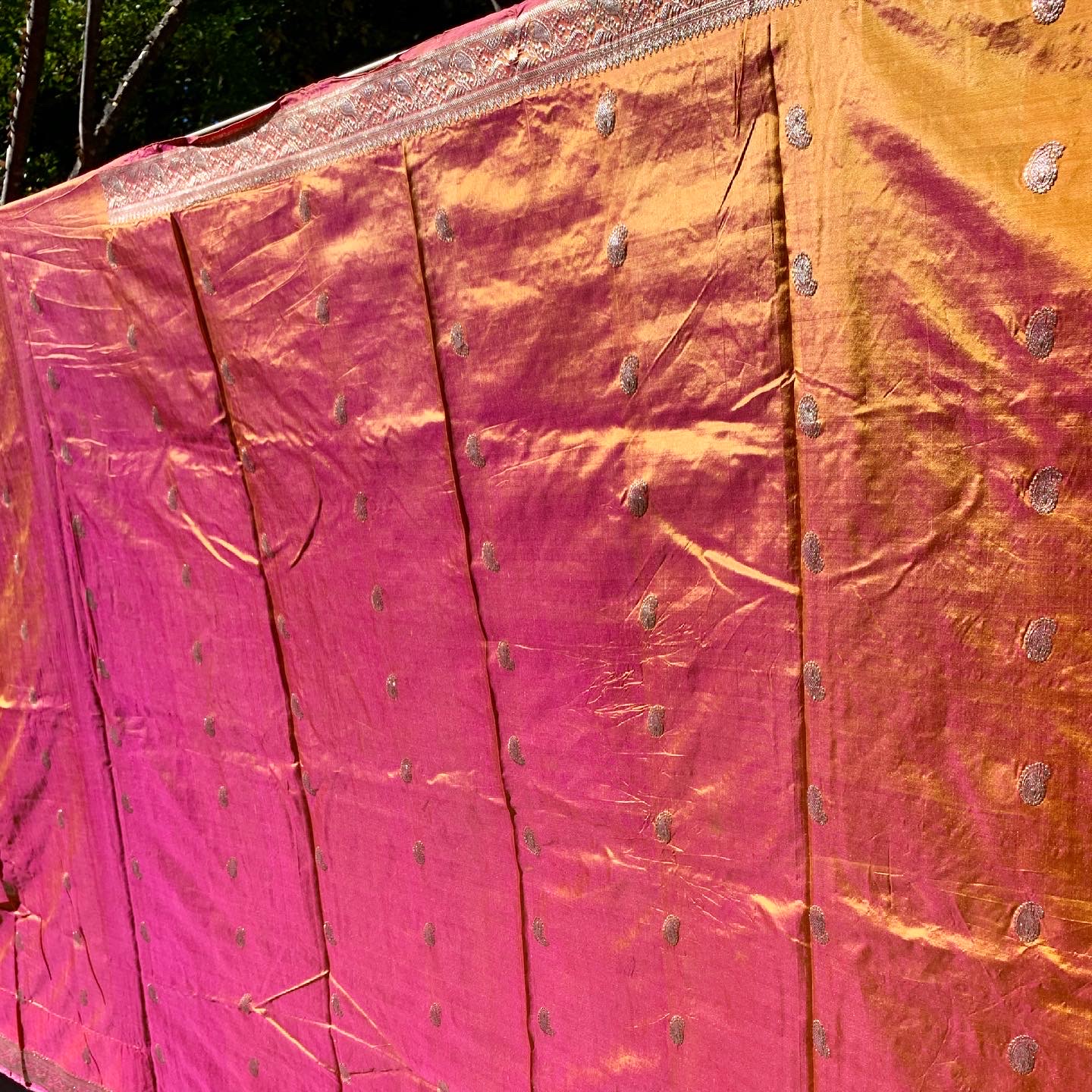 This joyful pink and orange shot silk sari comes from the sacred city of Banaras (also known as Varanasi). The deliciously light and soft sari has an iridescent appearance and is decorated with gold embroidered paisley motifs and the pallu (the decorative end piece of the sari used for draping) is quite elaborate. A cotton fall (just over 10cm wide) has been stitched along the inside edge of the bottom of the sari to enhance the draping. Dry clean only.