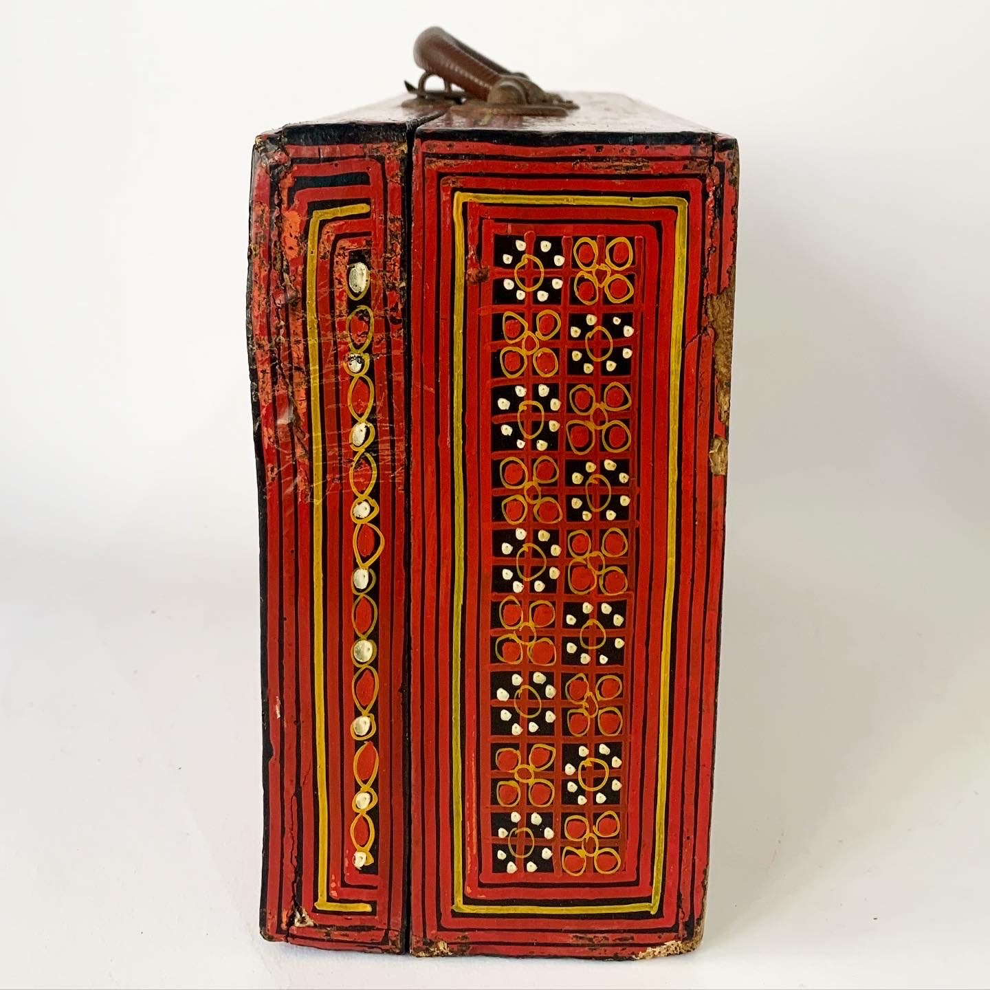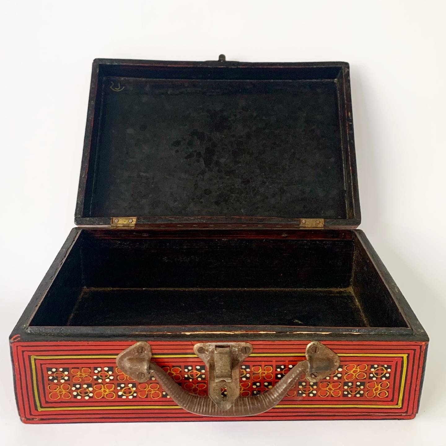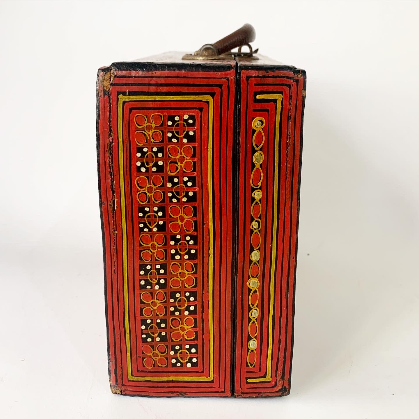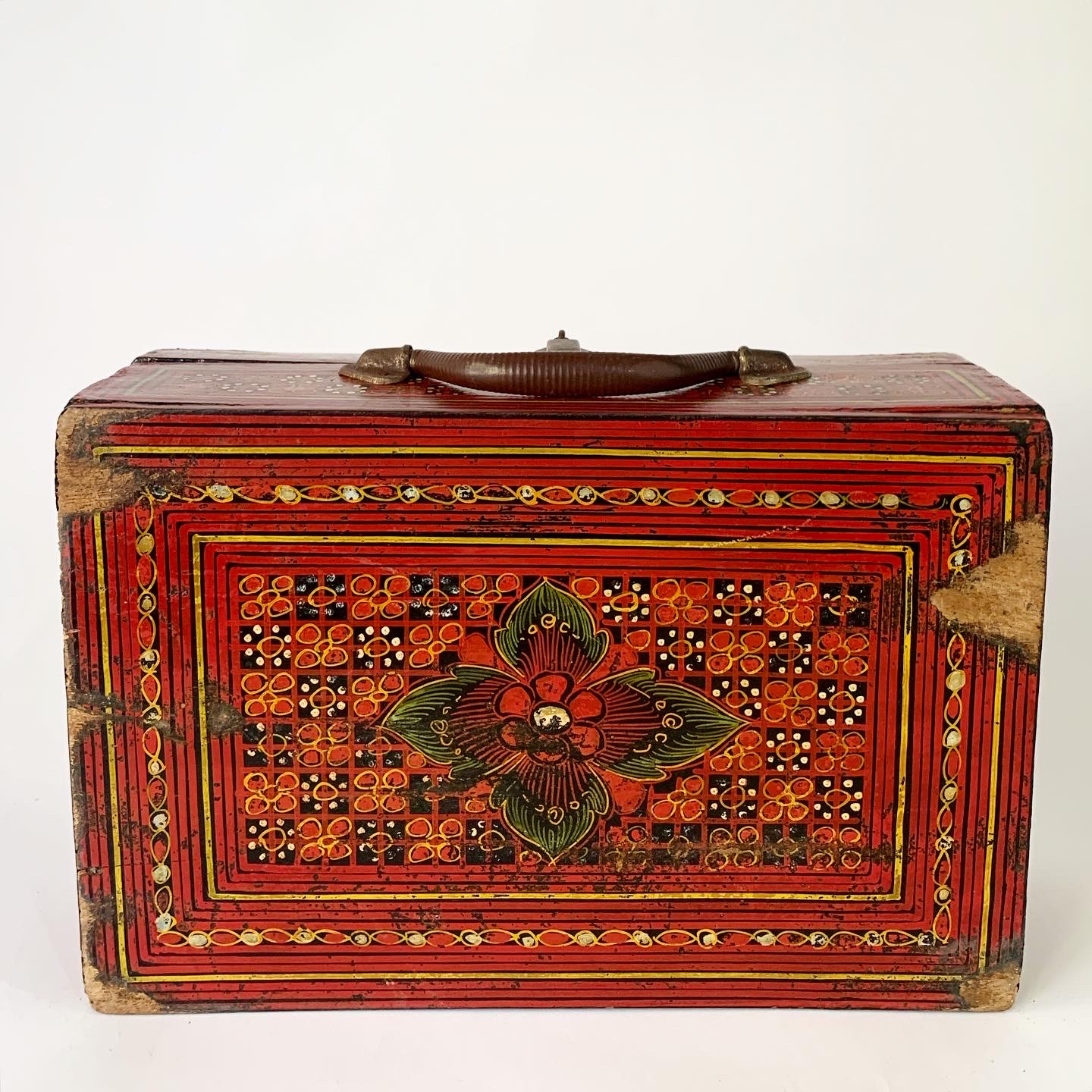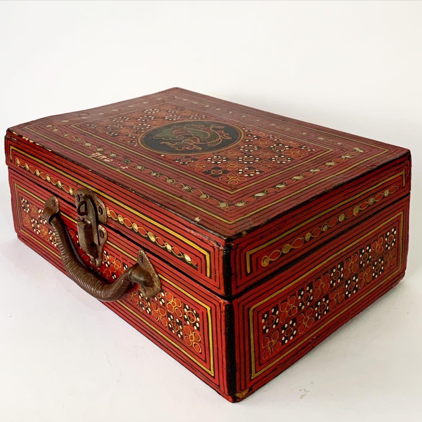 This gorgeous Burmese lacquerware school-case was handmade by specialist artisans in Myanmar (formerly Burma) in the late 19th century/early 20th century and today is a scarce and highly sought after object. The case is richly decorated on every external surface. There is bird motif on the top side and a floral motif on the bottom side. The owner’s name has been hand painted near the handle of the case. The interior is black lacquerware The antique case is in very good condition consistent with age, the latch and hinges work well, and the hand-paint work is vibrant. The underside has some wear and tear as per the photographs.
