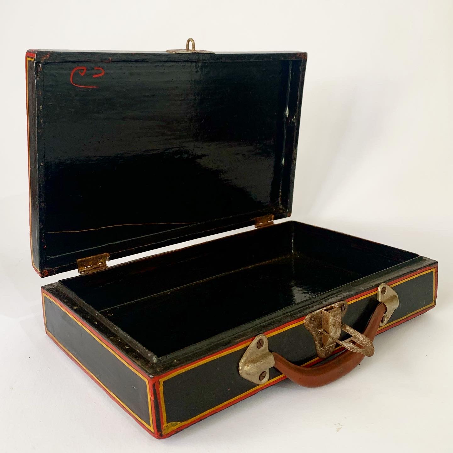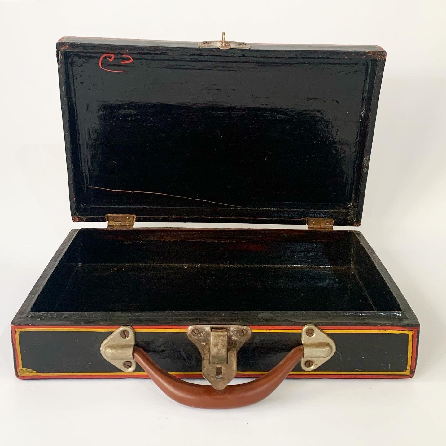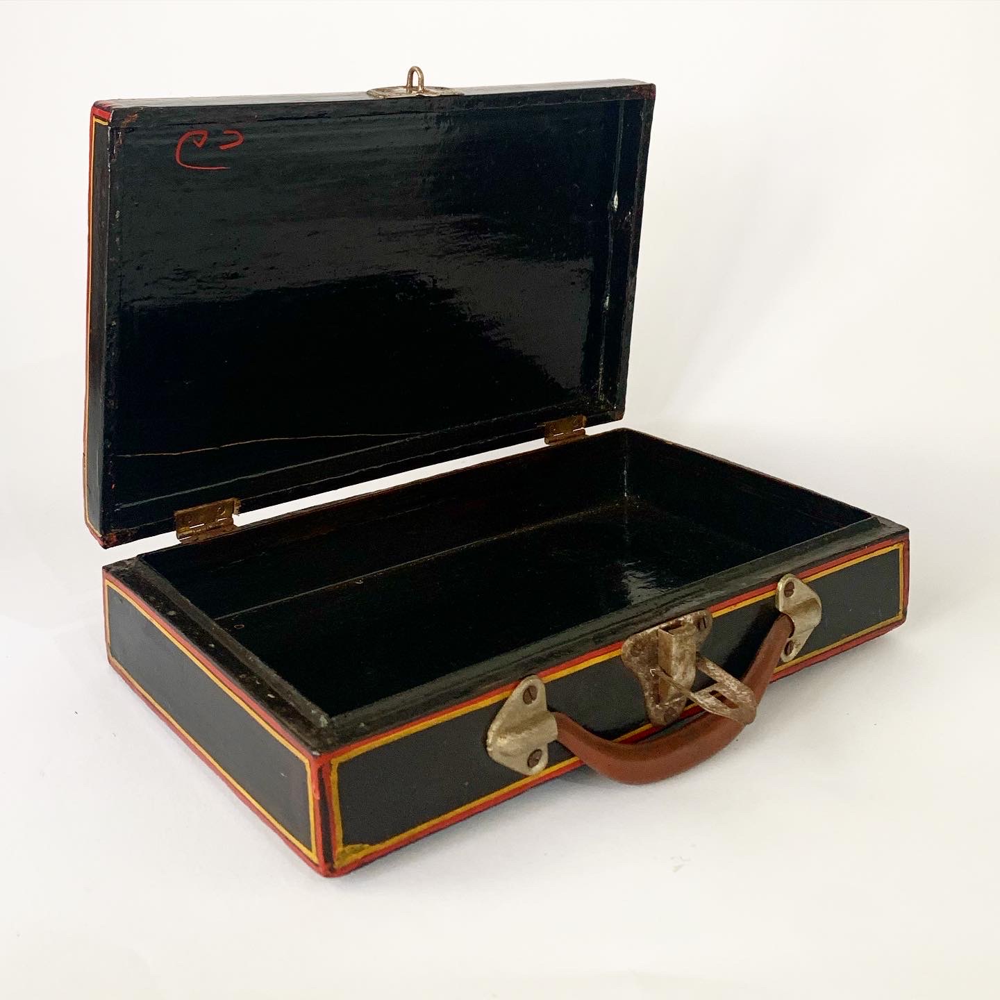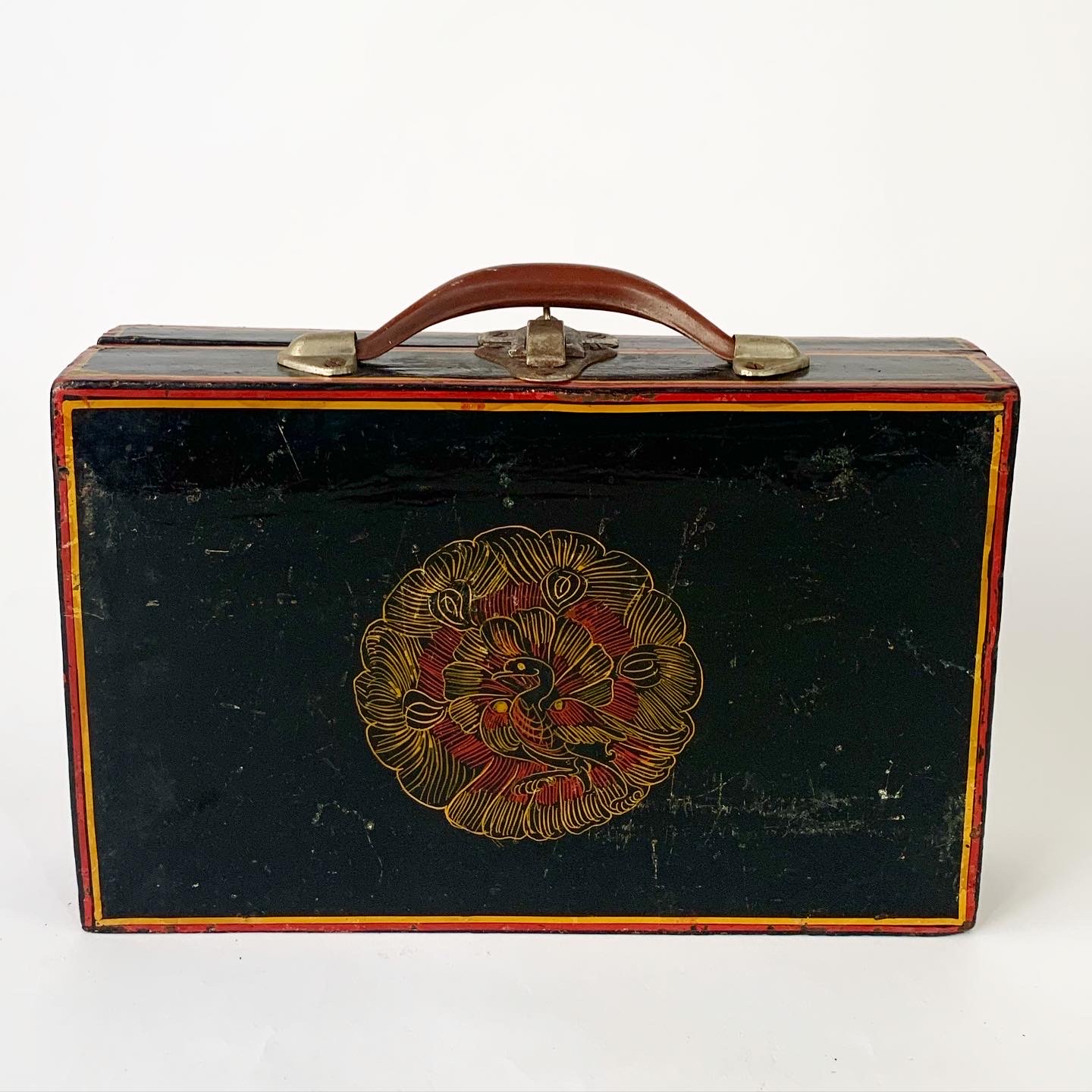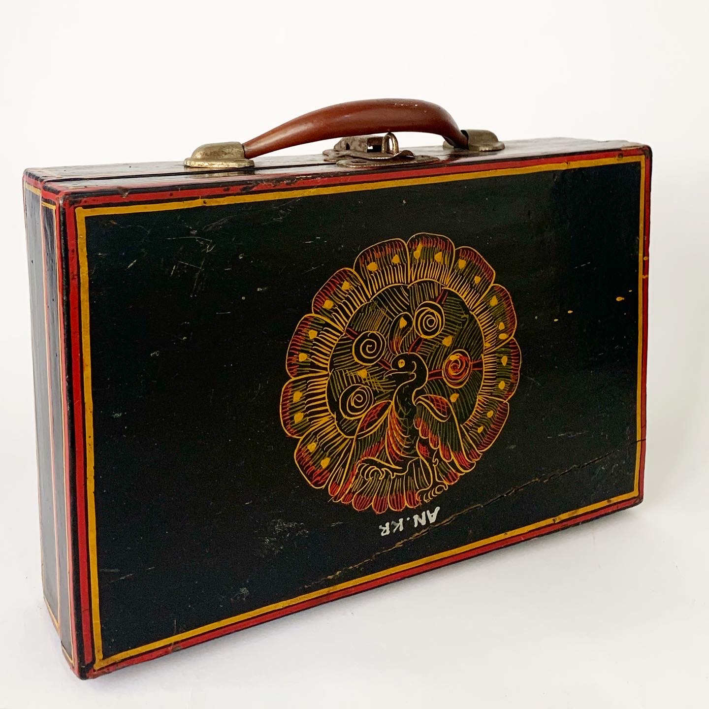This gorgeous Burmese lacquerware school-case was handmade by specialist artisans in Myanmar (formerly Burma) in the late 19th century/early 20th century and today is a scarce and highly sought after object. The case has been delicately hand painted and is decorated with a bird motif on both sides and is edged by yellow and red lines. The owner’s initials AN.KR have been added to the case. The case is in wonderful condition consistent with age, the latch works, and the paint work is vibrant and complete. There is a small crack on one side, but it does not detract from the beauty of the piece.