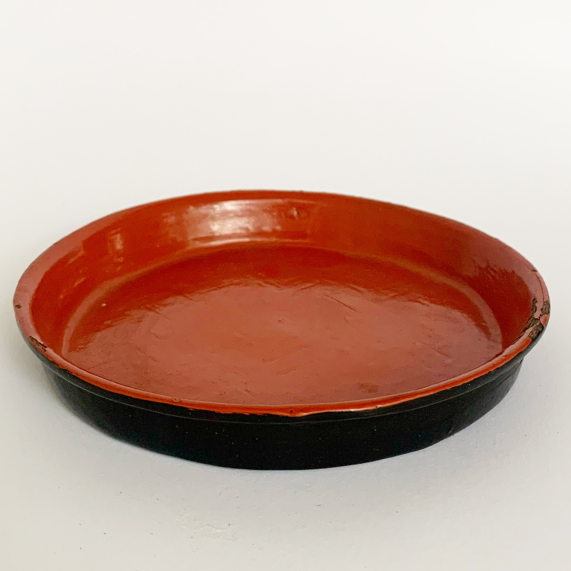 This Burmese lacquerware plate was handmade by specialist artisans in Myanmar (formerly Burma) in the late 19th century/early 20th century. This black and red plate has steep sides. The top of the plate is red, with the sides and base black. In good condition consistent with age, there is some cracking and chipping around the rim,