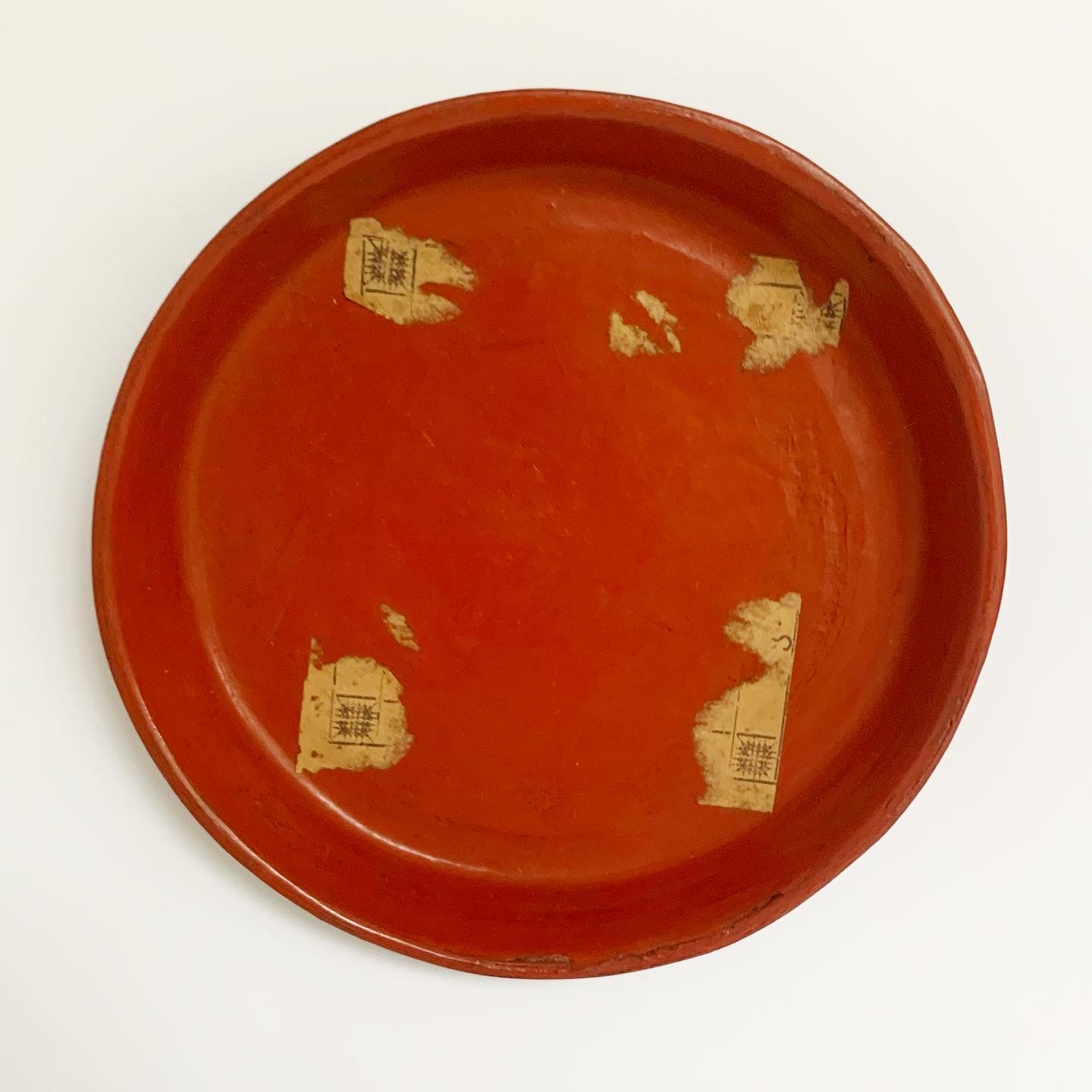 This Burmese lacquerware plate was handmade by specialist artisans in Myanmar (formerly Burma) in the late 19th century/early 20th century. This black and red plate has steep sides. The top of the plate is red, with the sides and base black. Parts of the original sticker remain, showing it has never been used. In good condition consistent with age, with some cracking around the rim.
