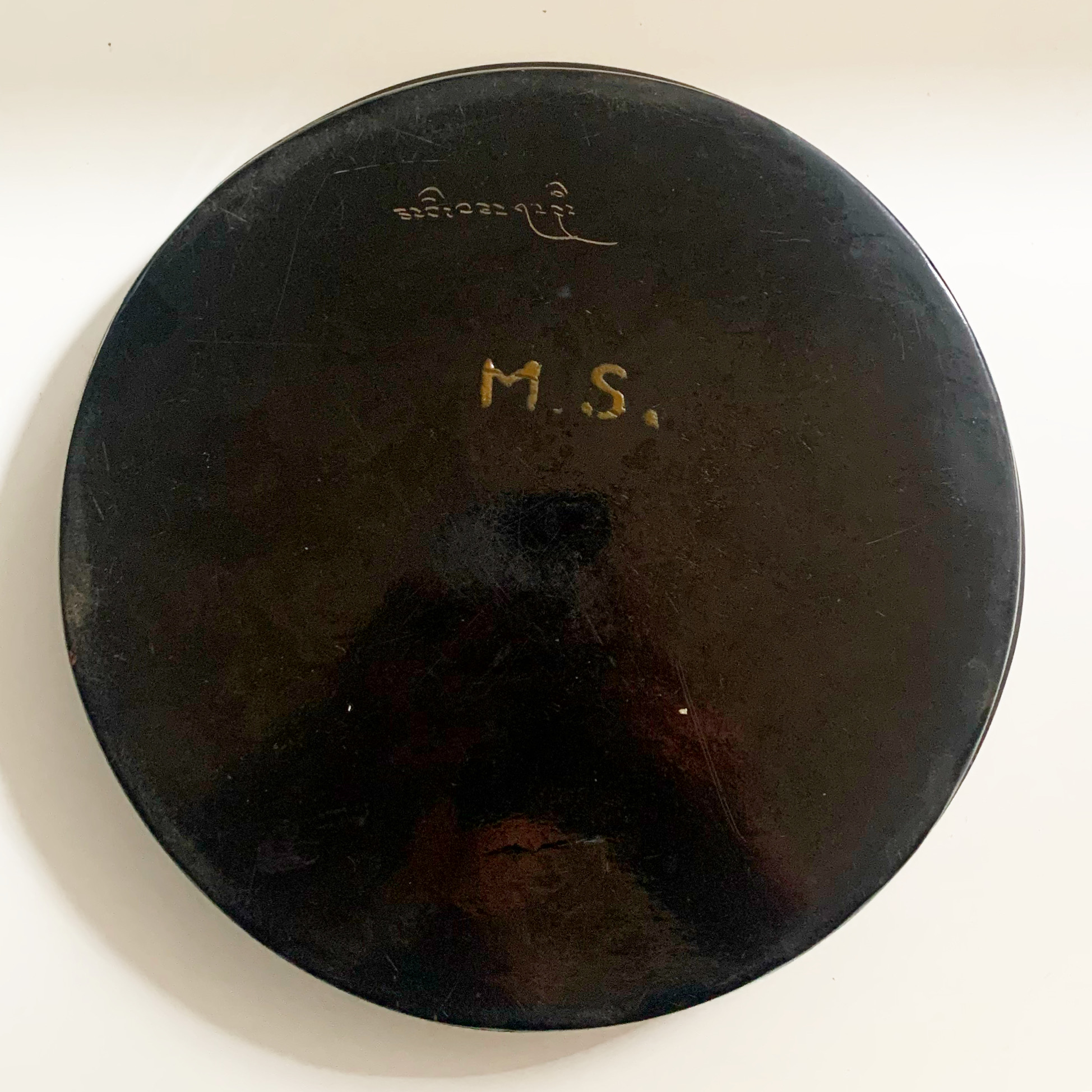This Burmese lacquerware plate was handmade by specialist artisans in Myanmar (formerly Burma) in the late 19th century/early 20th century. This black and red plate has steep sides. The top of the plate is red, with the sides and base black. On the base is a Tamil name engraved and the hand-painted initials M.S. These would have been added later because the Chettiars typically belonged to large joint families, with each branch of the family owning very similar objects of their diasporic heritage. It was important to etch their belongings, valuable or utilitarian, with their name to clearly indicate ownership. In very good condition, with some marks consistent with age.