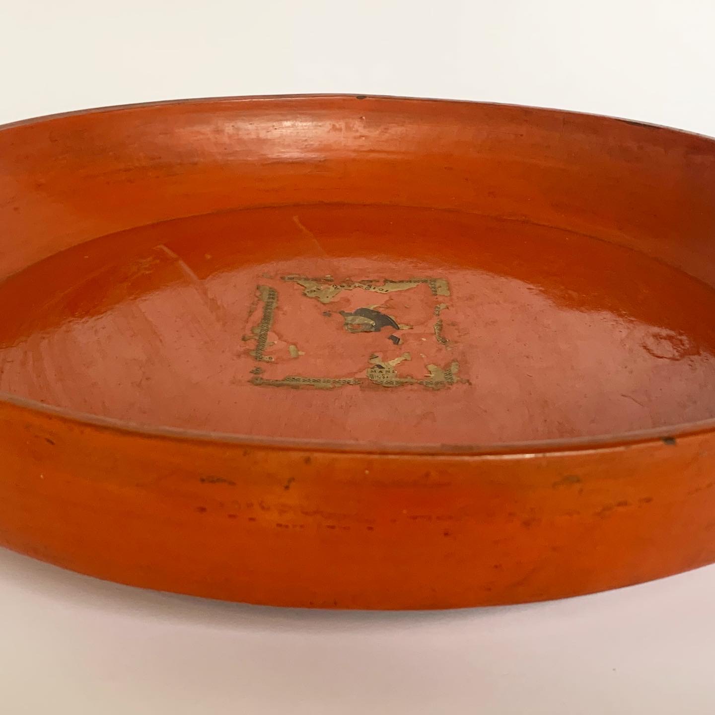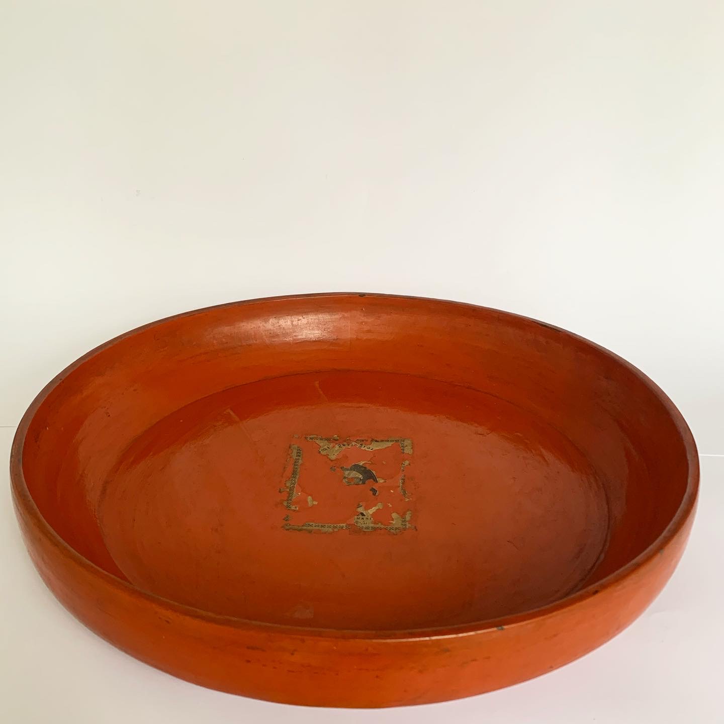 This Burmese lacquerware tray was handmade by specialist artisans in Myanmar (formerly Burma) in the late 19th century/early 20th century. This fabulous, large red lacquerware tray was carved from a single piece of teak wood and covered in multiple layers of lacquer. This solid piece would have traditionally been used to serve fruit or smaller bowls of food, where people would sit on the floor to eat. Parts of the original sticker remain, showing it has never been used. It has a splendid, aged patina and is both a dramatic interior object and also useful. In very good condition, consistent with age.