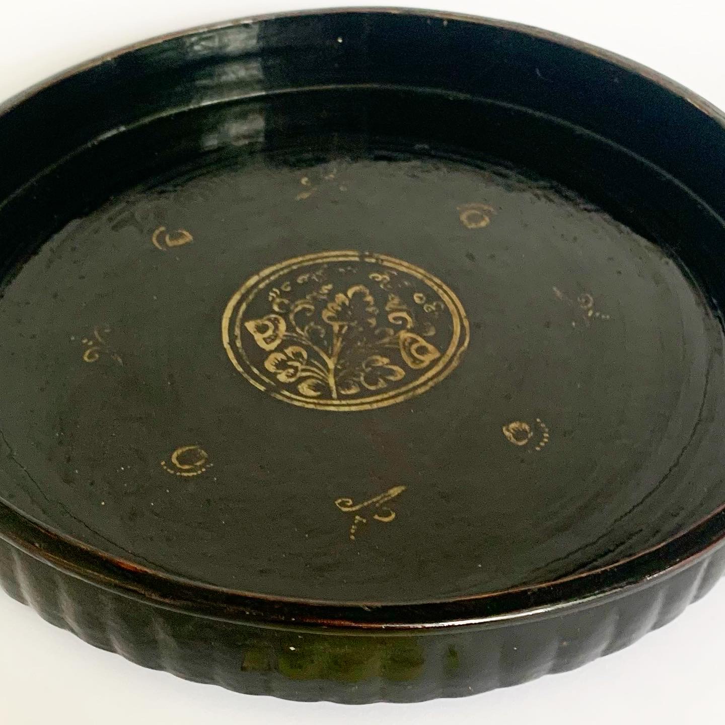 This Burmese lacquerware tray was handmade by specialist artisans in Myanmar (formerly Burma) in the late 19th century/early 20th century. This black and gold floral lacquerware tray has fluted sides. In the centre of the tray is a gold floral design within a double circle, and Burmese writing, which is too faded to read. Around this are designs made by exposing the contrasting greyish matt finish of the underlying priming material as a background. Then the floral designs are more highly polished. A few of these designs have also then been picked out in gold. These were usually commissioned by European residents, inspired by the subtler Far Eastern lacquerware. Some fading of the gold areas due to age and use.