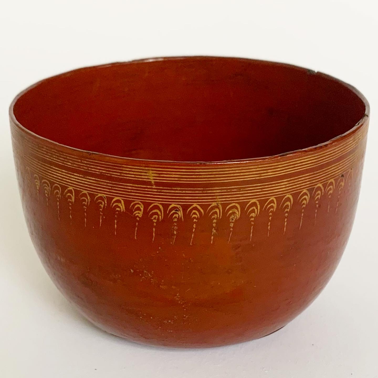 This red Burmese lacquerware water bowl was handmade by specialist artisans in Myanmar (formerly Burma) in the late 19th century/early 20th century. The thin-walled bowl has been delicately engraved around the top with fine parallel line bands and a delicate fringe design. The inside of the cup is also lacquered the same red colour. In fair condition for its age, there is one small chip on the rim and some minor cracks in the lacquer.