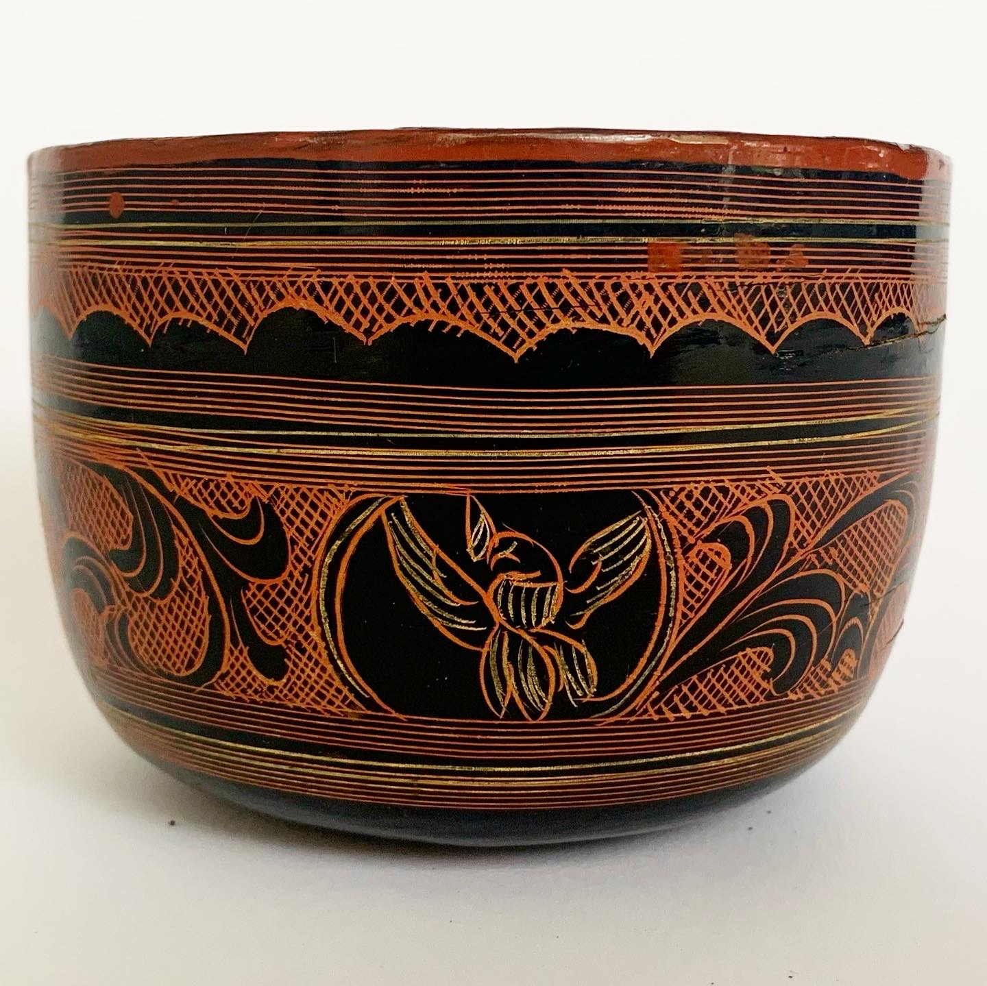 This black and red Burmese lacquerware water bowl was handmade by specialist artisans in Myanmar (formerly Burma) in the late 19th century/early 20th century. The thin-walled bowl has been delicately engraved with foliate designs and three birds in a central band. The bird’s wings and framing line bands also have some yellow, a rarer colour. Around these is a background of red hatching, which repeats in the top border above a design of black rolling semi circles. On the base, middle and top are layers of fine parallel lines giving the design a beautiful cohesion. The inside of the cup is also lacquered the same red. In excellent condition, with minimal wear for its age, there is no chipping or cracking.