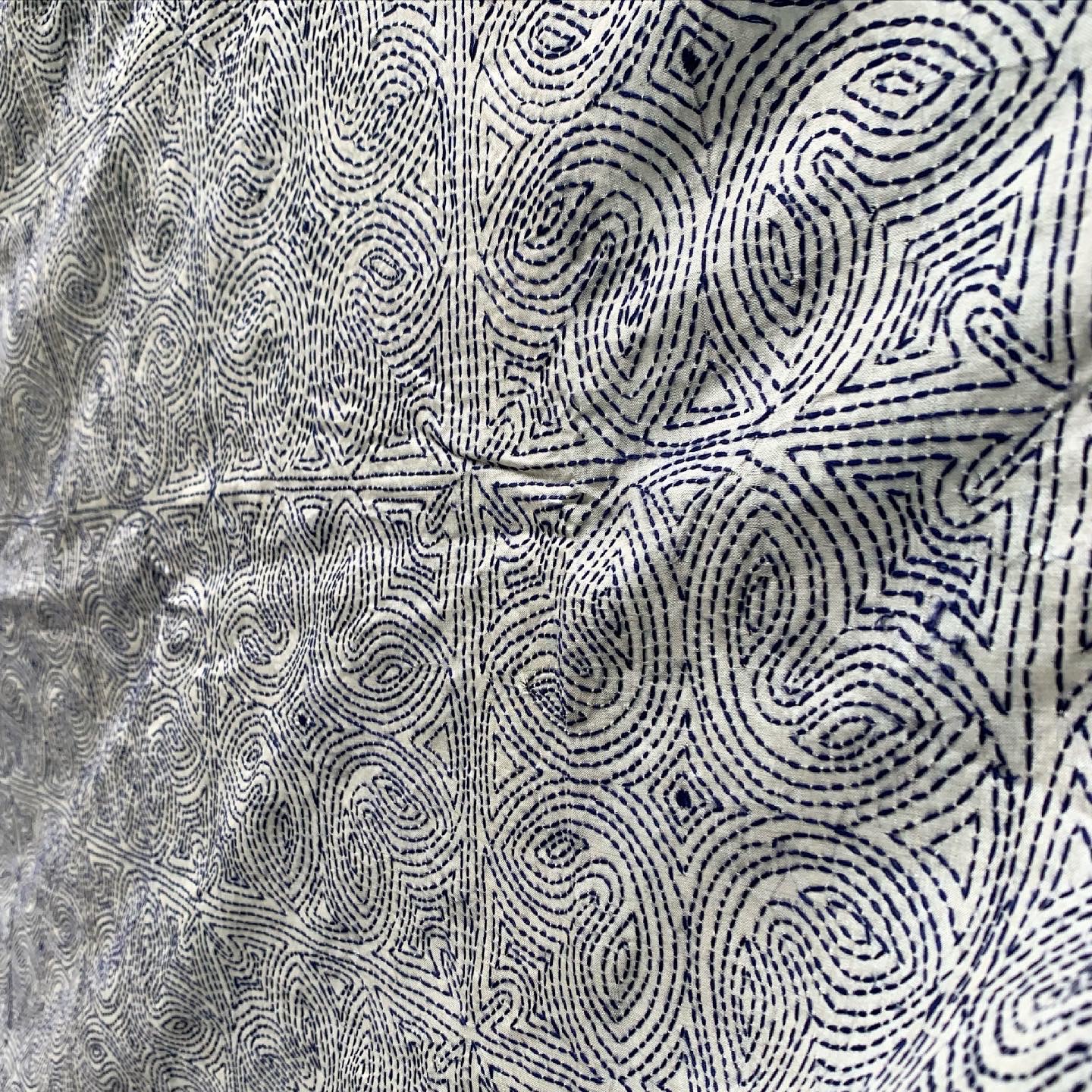 This extraordinary piece is a kantha sari from West Bengal. The entire length of cream silk has been intricately hand-embroidered with a dark navy-blue thread. Dry clean only.