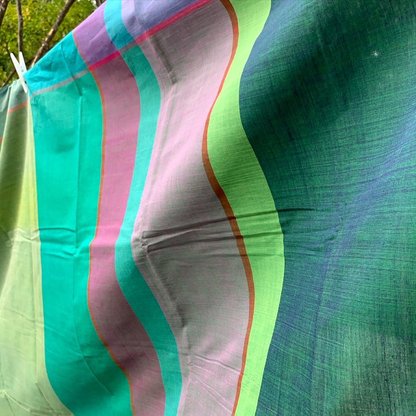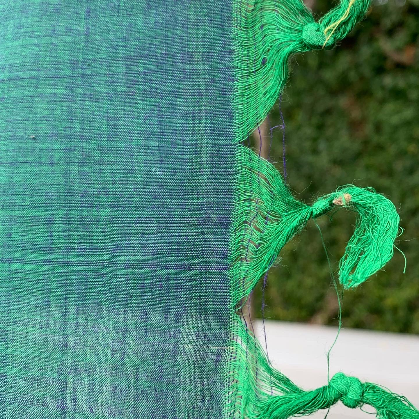 This cool, lime green, cotton sari with a light blue border was hand-woven in South India. It is the result of a collaboration between a contemporary designer working closely with a team of traditional weavers. The pallu (the decorative end piece of the sari used for draping) features a range of bold colour blocks in greens and purples and has a tasselled edge. There is some colour variation within the green, which is not uncommon for a handmade piece. Hand wash or dry clean.