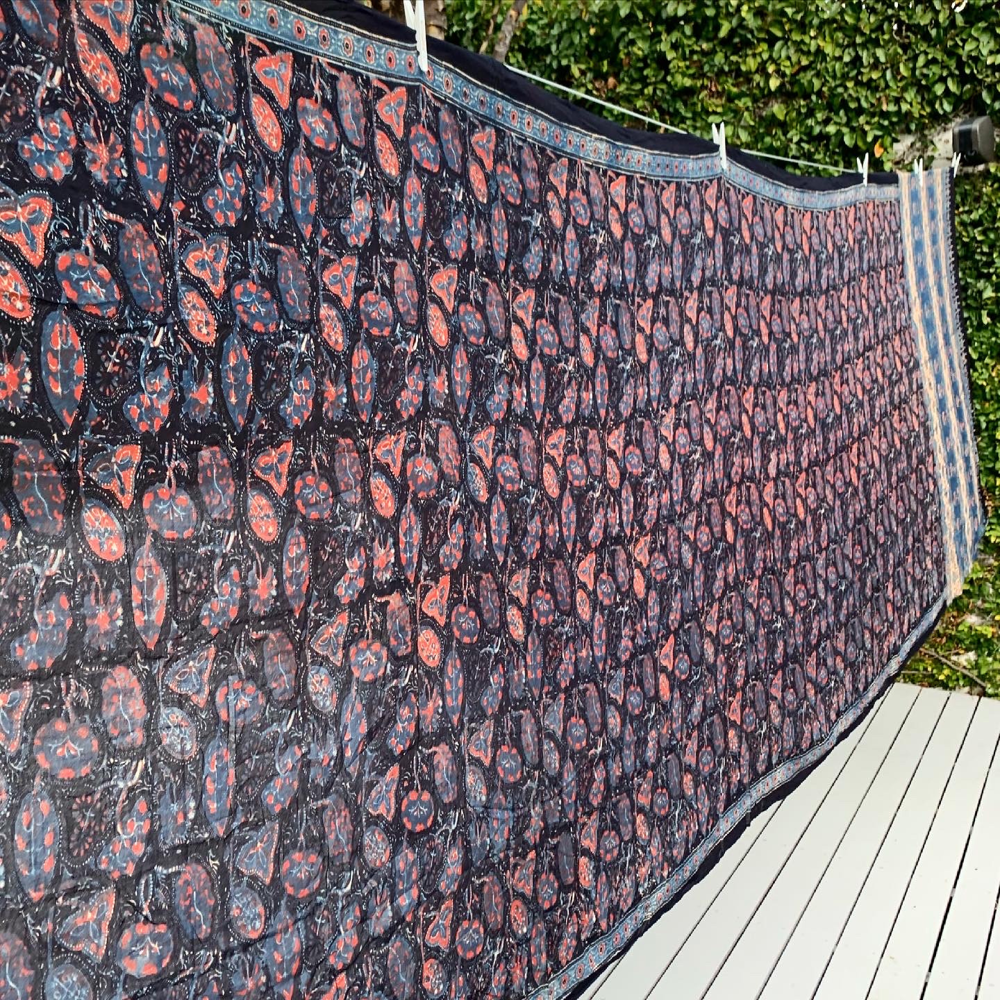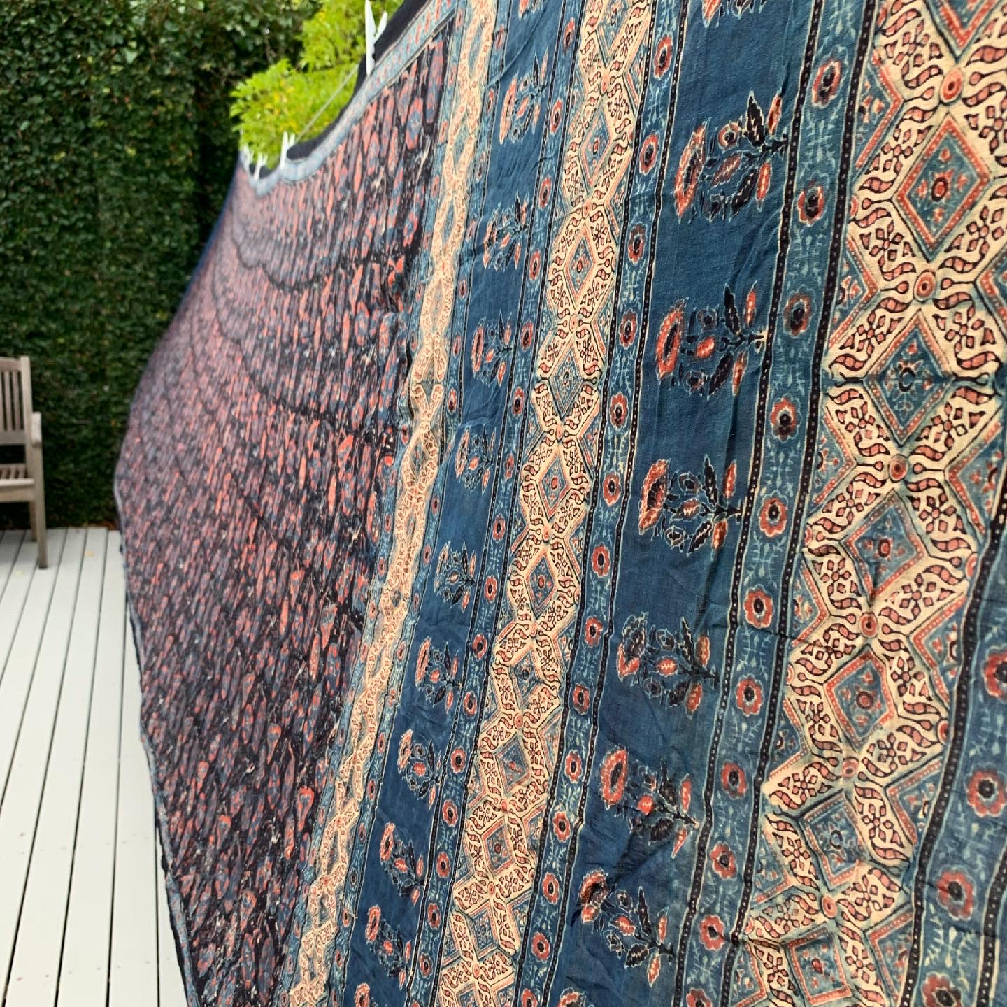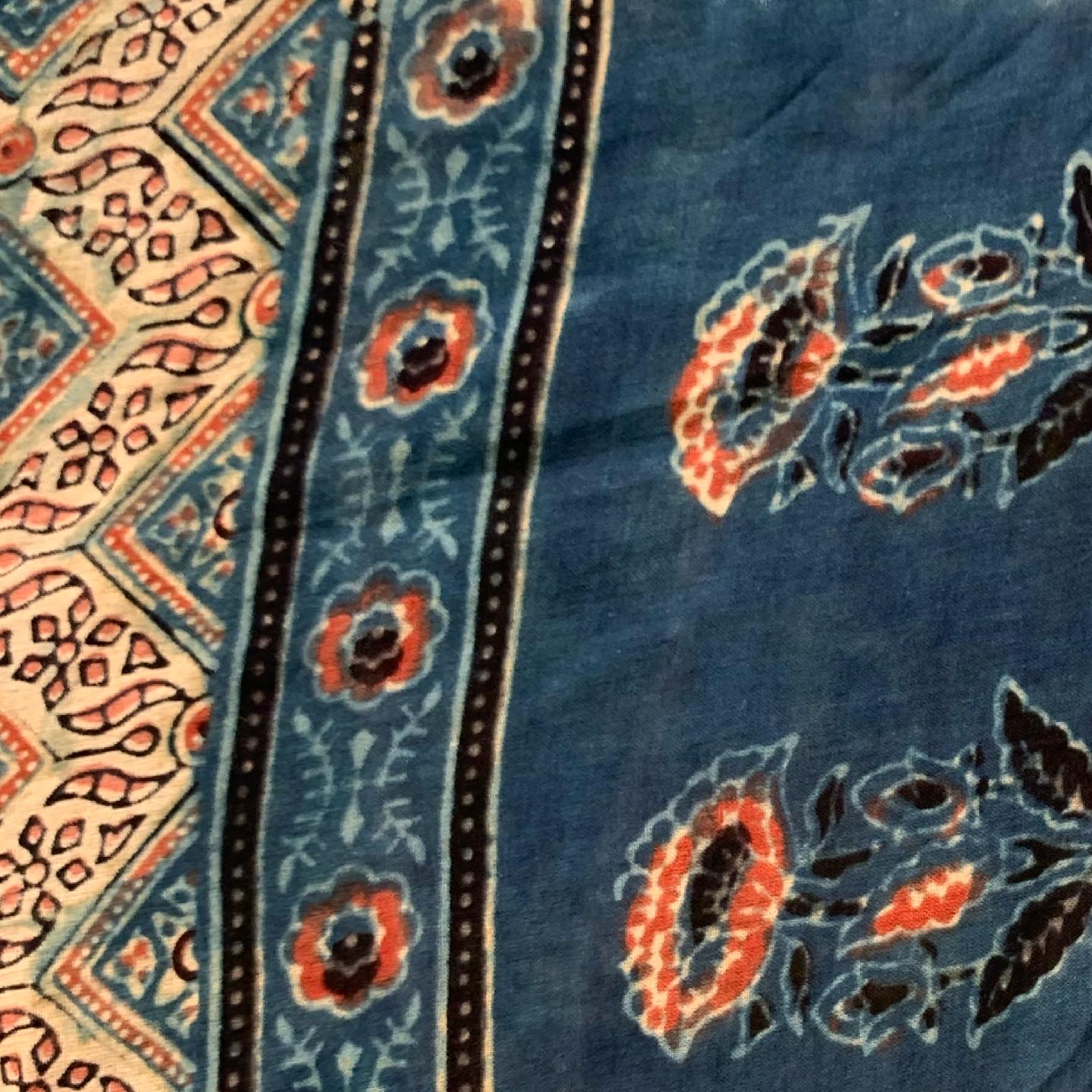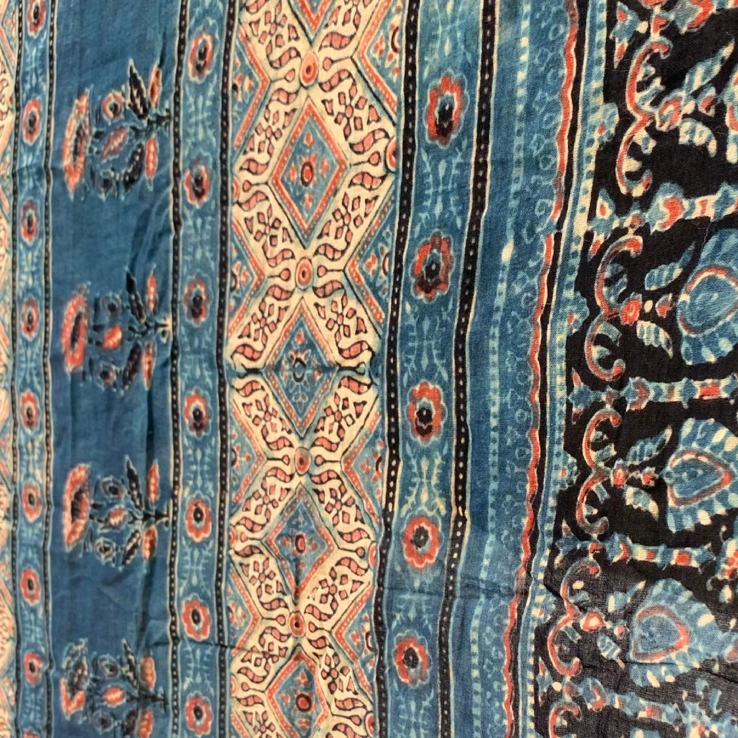 This incredibly soft, cotton sari is totally splendid and drapes beautifully. Made in the specialist village of Ajrakhpur in Kutch, Gujarat, by a family who has been practicing the craft for ten generations. This piece is an Ajrakh hand-block printed with indigo (blue) and majistha (red) natural vegetable dyes in floral patterns. The sari includes a 100 cm blouse piece in plain indigo. It would also be superb to use for garments. Dry clean only.