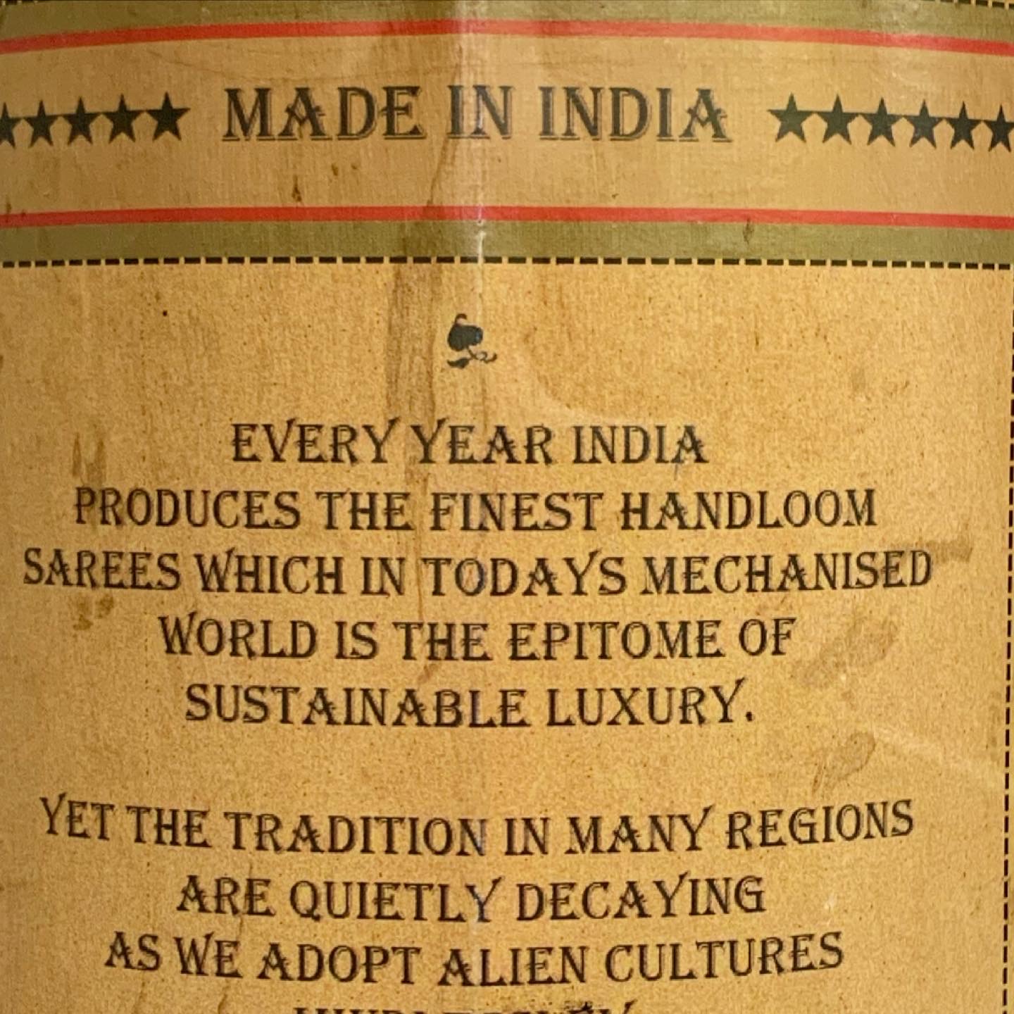 Since starting a small workshop in Kolkata in 2001 Sabyasachi Mukherjee has in the last two decades risen to become India’s most revered designer. His passion for Indian textiles and craft and his meticulous attention to detail are evident in his collections. Sabya is deeply committed to reviving and preserving traditional craft skills and as well as employing thousands of artisans directly he has a foundation to support artists and around a decade ago he instigated the “Save the Saree” project. This soft muslin sari is from that project and is a superb jamdani (muslin) hand-woven in Bengal. It is gentle piece infused with the skill of the artisans. Sabya encourages you to “wear a sari and save a weaver ‘and considers India’s fine handlooms to be the epitome of sustainable luxury. This piece comes packaged in lovely tin. Hand wash or dry clean.