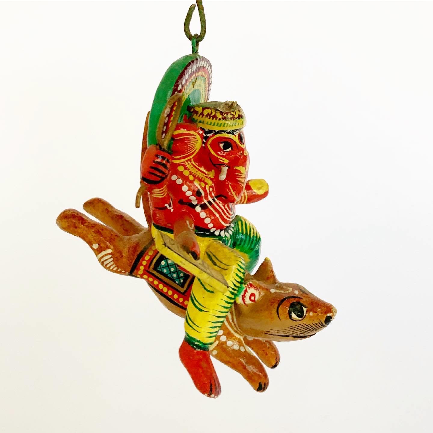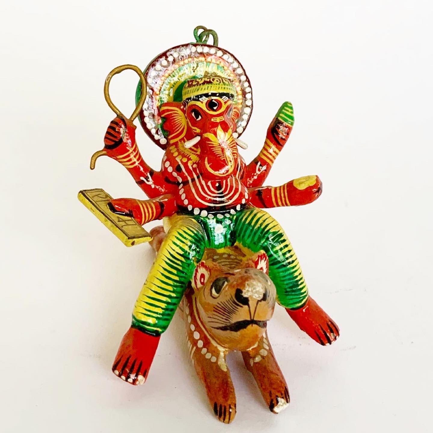 The finely carved and painted figure of Lord Ganesha, with his vahanna (vehicle) Mooshika (mouse), was hand-carved and hand painted in Varanasi, in the central state of Uttar Pradesh. It is in pristine condition. Ganesha, also known as Ganapati, is one of the most loved and most worshiped deities in the Hindu pantheon. He is the god of new beginnings, remover of obstacles, bestower of favours and granter of success. Ganesha is also the patron of intellectuals and writers. In this piece, Ganesh is richly garlanded and in each of his four arms he holds a different item, including a book, a noose (to help him catch obstacles and remove them), a conch shell (a symbol of victory and accomplishment) and a laddu (sweet), of which he is very fond. This piece comes with a hook ready to hang.