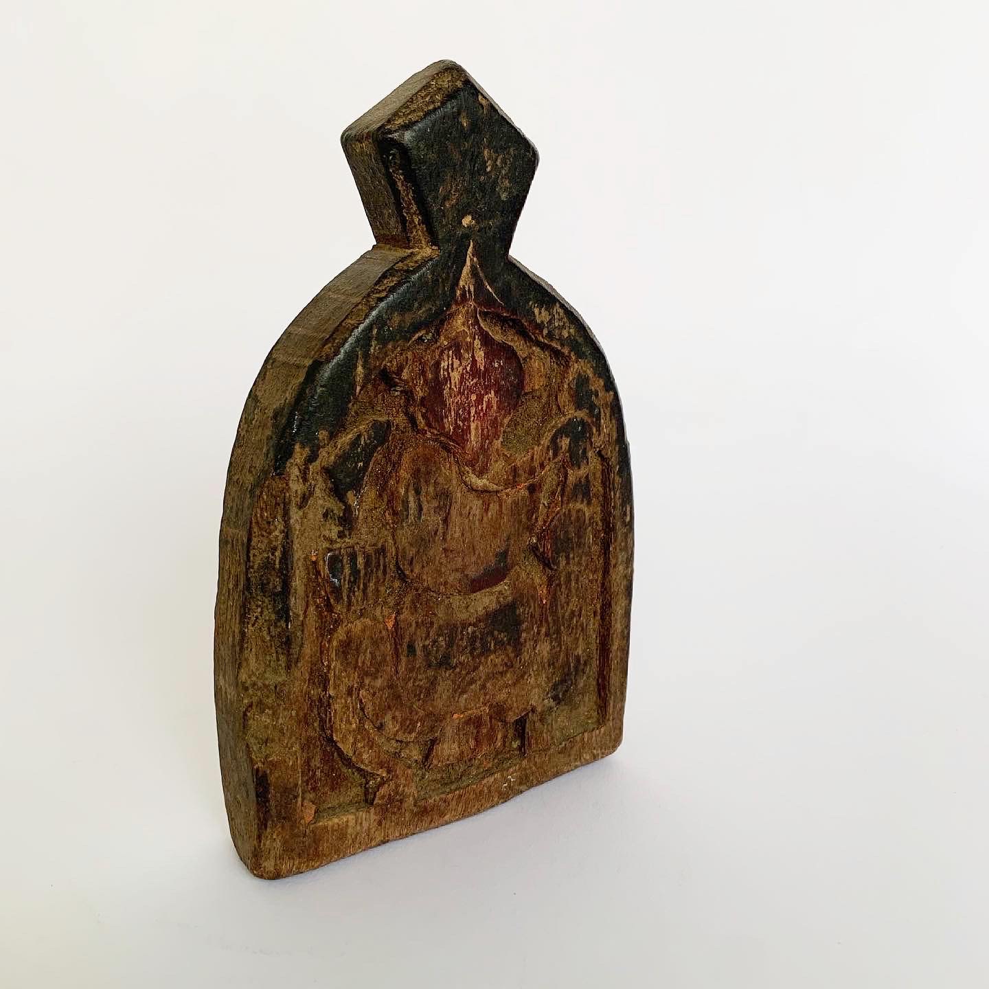 This wonderful old wooden panel features a hand carved Ganesha, also known as Ganapati, who is one of the most loved and most worshiped deities in the Hindu pantheon. The elephant headed god is revered as the god of wisdom and the god of new beginnings, remover of obstacles, bestower of favours and granter of success. He is also the patron deity of writers. This piece may have come from a home and the red colour shows signs that it has been worshipped with the application of red sindoor (vermillion) powder.