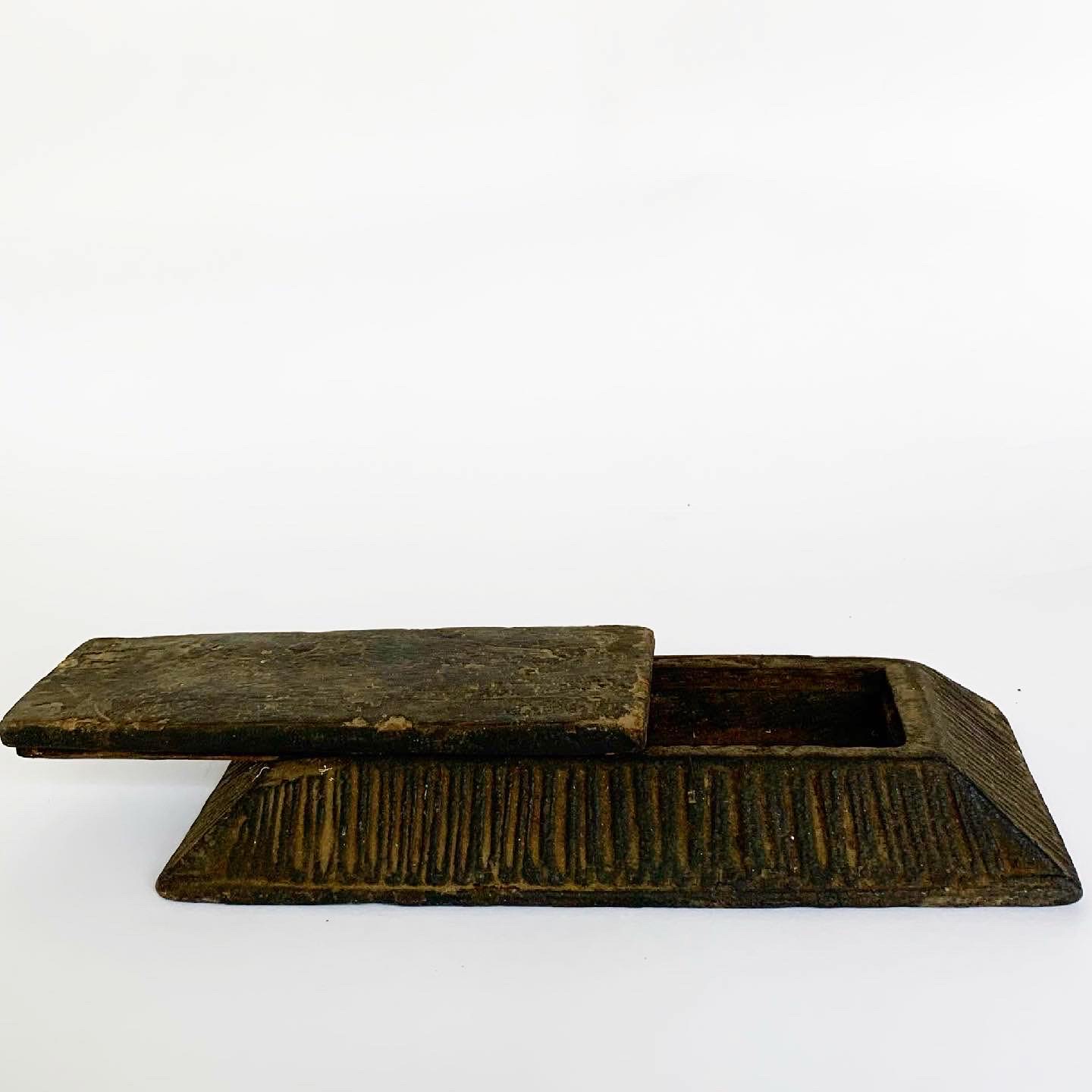 This hand carved ink tablet holder for scribes, with a sliding lid, is from the mid to late 19th century. It was sourced from an antique dealer in the spectacular Himalayan town of Leh, which was the historical capital of the Kingdom of Ladakh. From the middle of the 17th century to the middle of the 20th century, Ladakh was an important hub on the busy caravan trade routes between Central Asia and the Punjab in Northern India, and between Kashmir to the west of Ladakh and Tibet to the east. Ladakh is home to some fine craftsmen that are well known for their wood carving skills, most evident at the spectacular Buddhist monasteries. It would make a lovely storage piece for some special treasures.