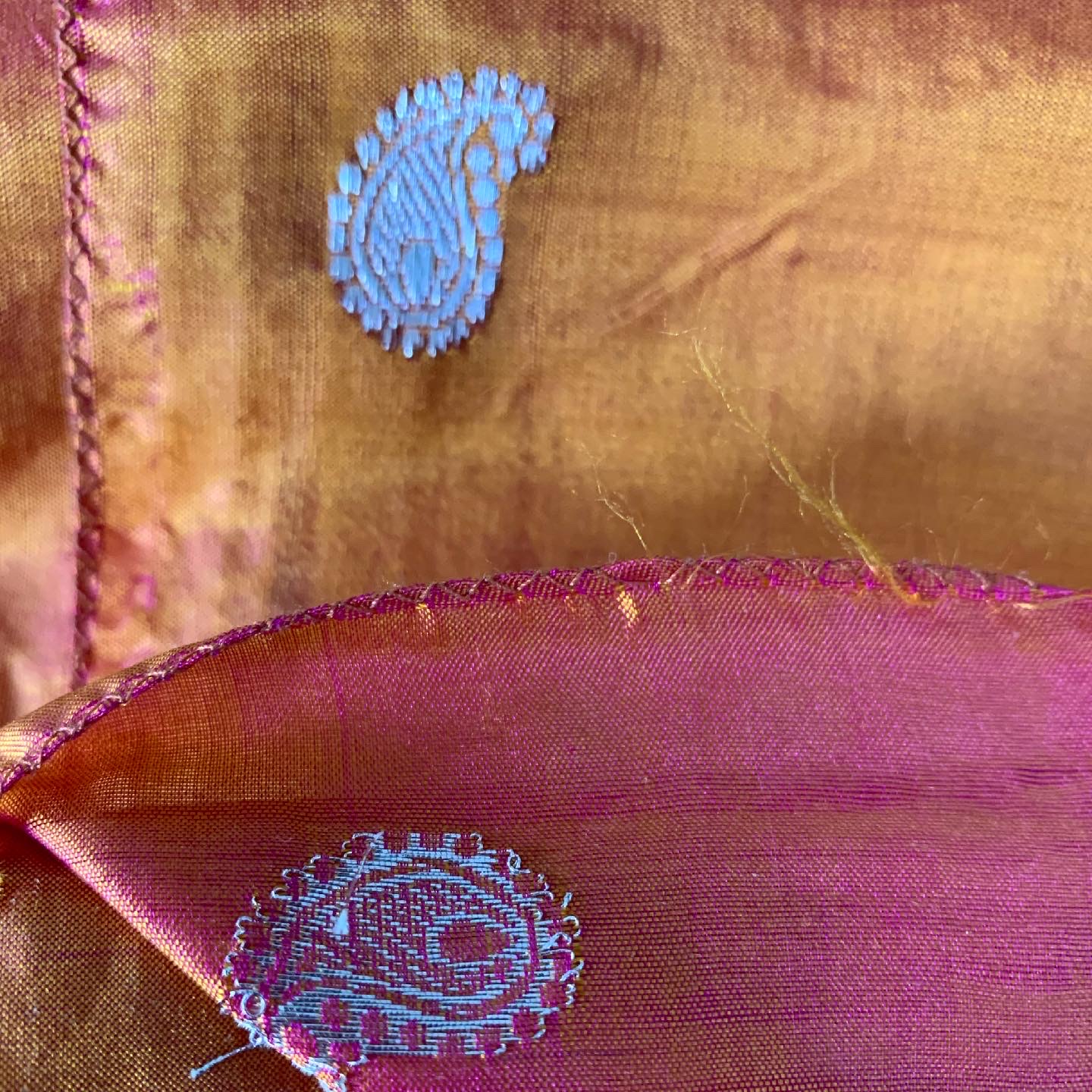 This joyful pink and orange shot silk sari comes from the sacred city of Banaras (also known as Varanasi). The deliciously light and soft sari has an iridescent appearance and is decorated with gold embroidered paisley motifs and the pallu (the decorative end piece of the sari used for draping) is quite elaborate. A cotton fall (just over 10cm wide) has been stitched along the inside edge of the bottom of the sari to enhance the draping. Dry clean only.