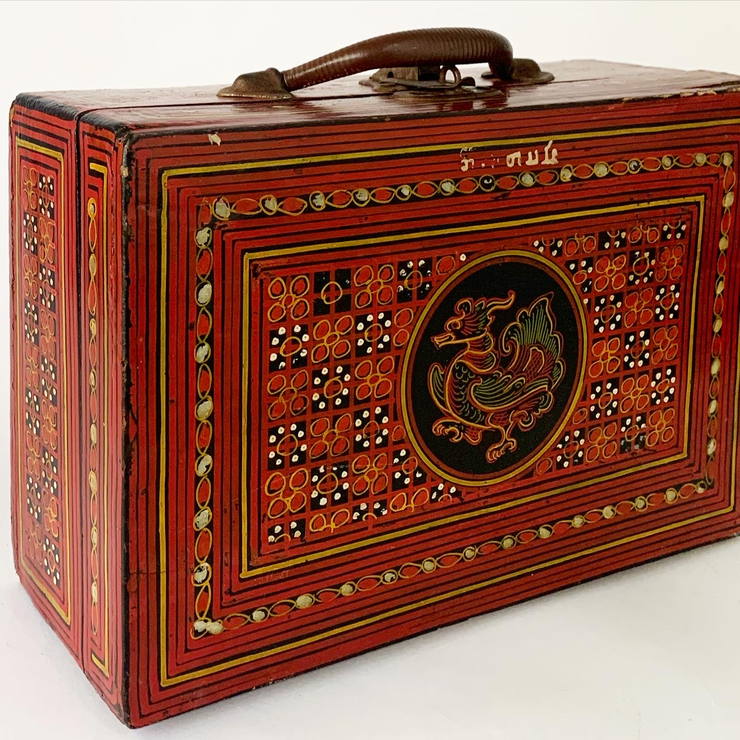 This gorgeous Burmese lacquerware school-case was handmade by specialist artisans in Myanmar (formerly Burma) in the late 19th century/early 20th century and today is a scarce and highly sought after object. The case is richly decorated on every external surface. There is bird motif on the top side and a floral motif on the bottom side. The owner’s name has been hand painted near the handle of the case. The interior is black lacquerware The antique case is in very good condition consistent with age, the latch and hinges work well, and the hand-paint work is vibrant. The underside has some wear and tear as per the photographs.