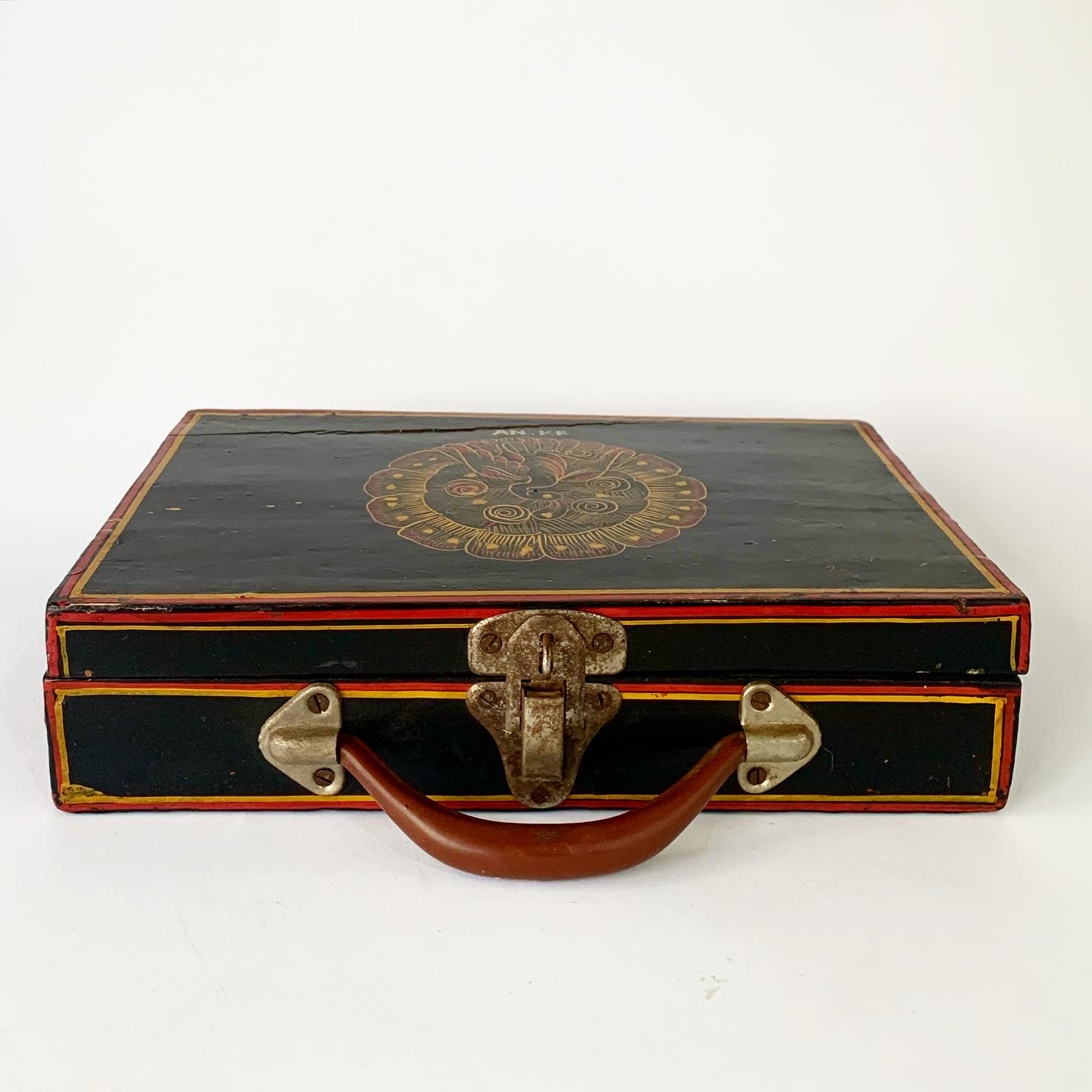 This gorgeous Burmese lacquerware school-case was handmade by specialist artisans in Myanmar (formerly Burma) in the late 19th century/early 20th century and today is a scarce and highly sought after object. The case has been delicately hand painted and is decorated with a bird motif on both sides and is edged by yellow and red lines. The owner’s initials AN.KR have been added to the case. The case is in wonderful condition consistent with age, the latch works, and the paint work is vibrant and complete. There is a small crack on one side, but it does not detract from the beauty of the piece.