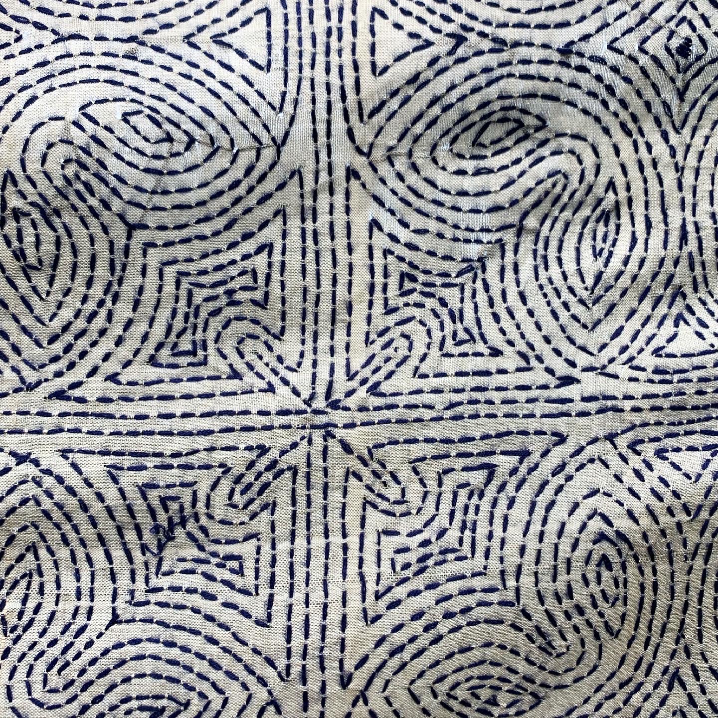 This extraordinary piece is a kantha sari from West Bengal. The entire length of cream silk has been intricately hand-embroidered with a dark navy-blue thread. Dry clean only.