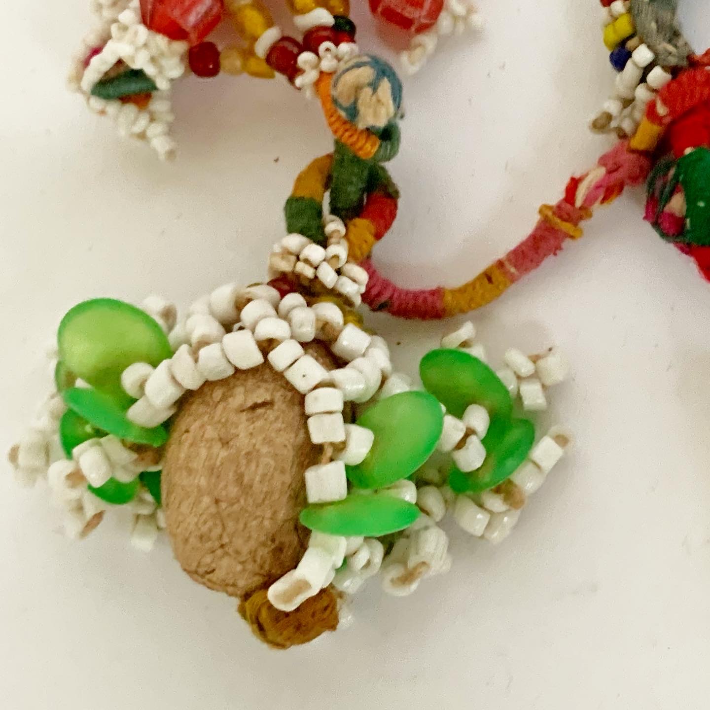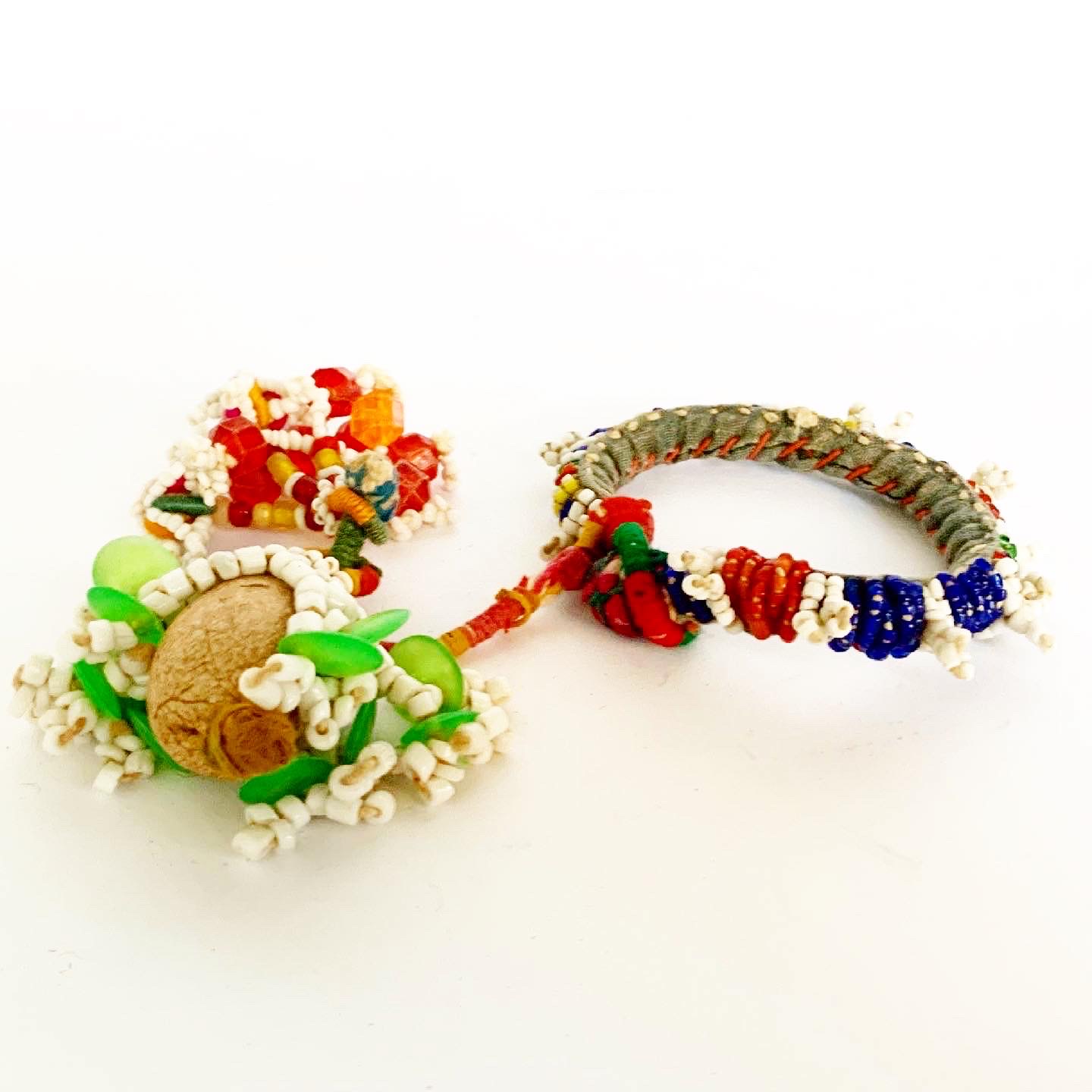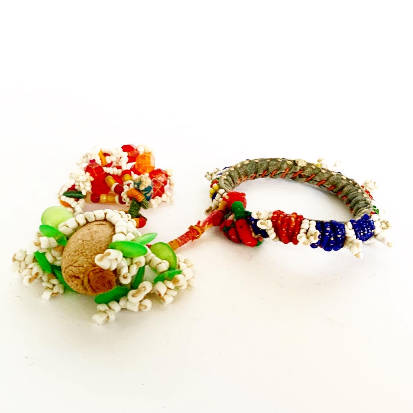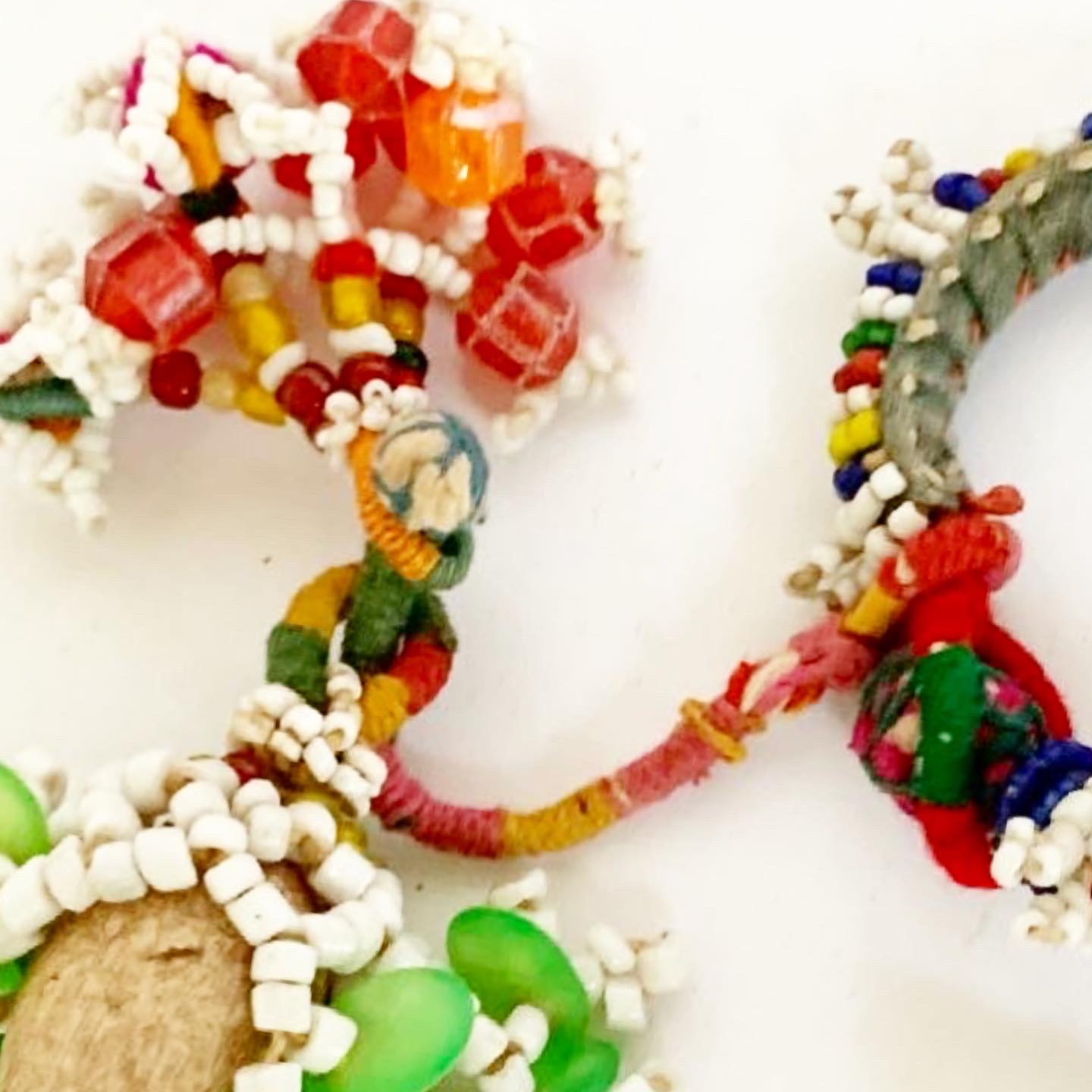 This vibrant, multi-coloured, handmade, glass beaded ring has two tassels and is from Rajasthan. It was sourced in Bikaner, the red city, which is surrounded by the Thar Desert and once prospered because of its strategic route on the overland caravan trade between Central Asia and China. This decorative piece would make a fabulous napkin ring, sure to enhance any tablescape or could be used as curtain tie or for fashionistas, it might make a rather special belt or handbag accessory.