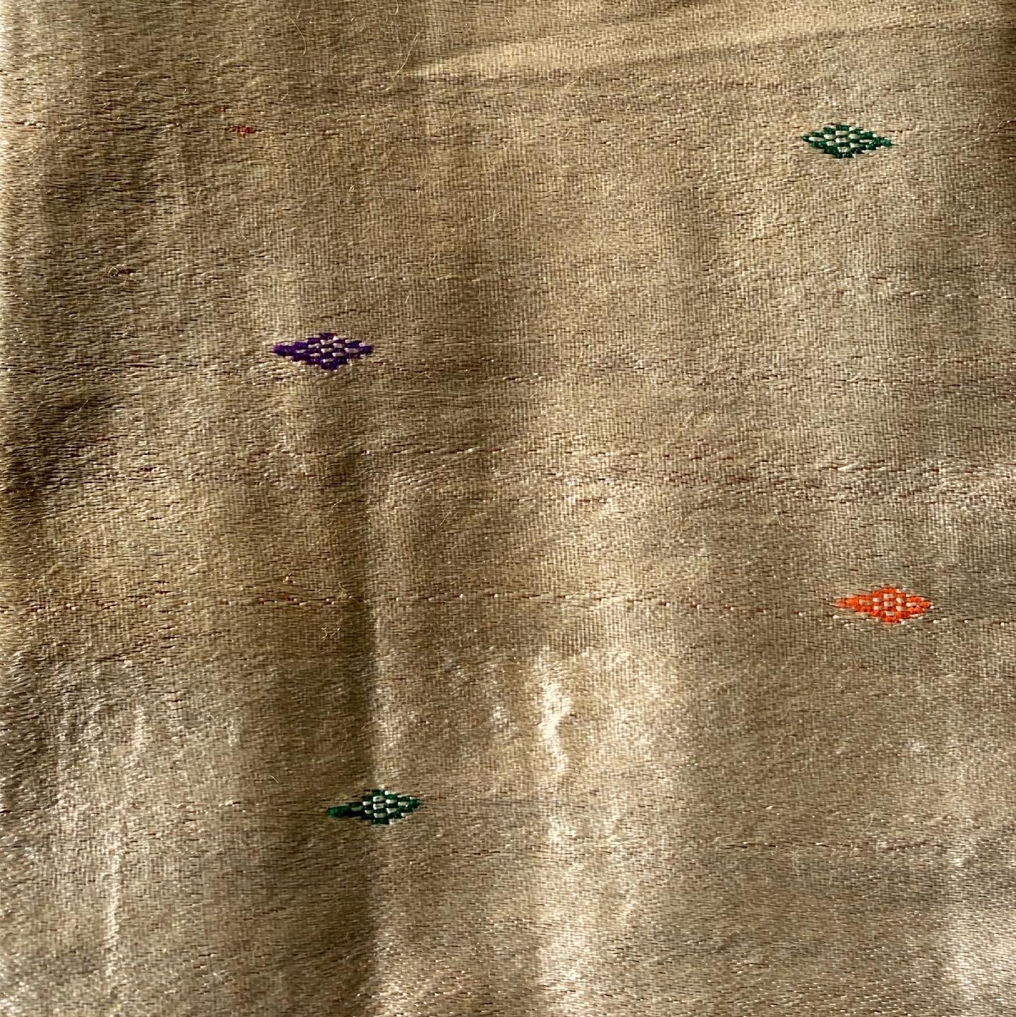 A gorgeous, soft gold, mashru fabric embellished with a small, repeating, colourful diamond pattern. It was bought from a specialist textile dealer in Ahmedabad. Mashru is an Arabic word and is the term used for a special mixed fabric woven with a silk warp and a cotton weft. Muslim men who were prohibited to wear pure silk fabric against their body traditionally wore this textile. The silk yarns are on the outer side and the cotton on the inner side. The silk weave provides a luxurious sheen. Today only a few families in the village of Patan, North Gujarat (about three hours north of Ahmedabad) continue to weave this traditional textile. Dry-clean only.