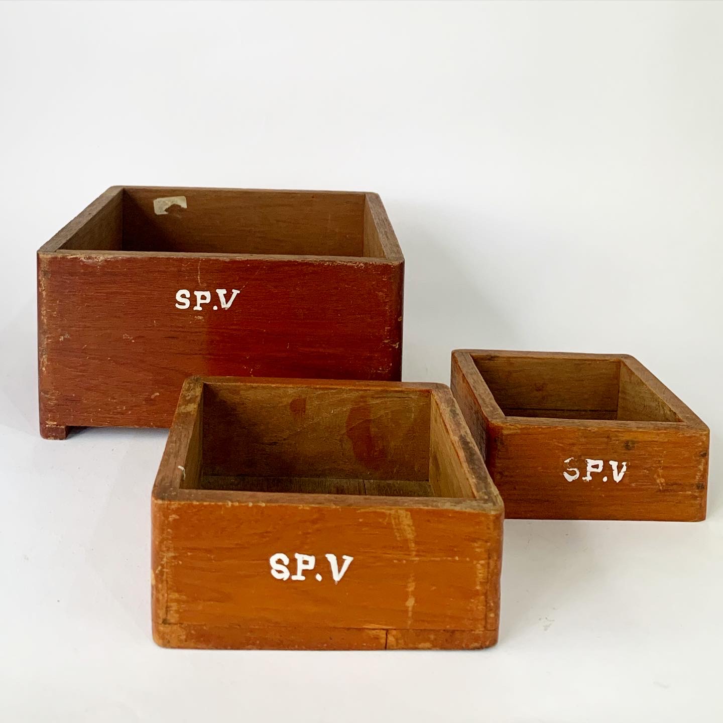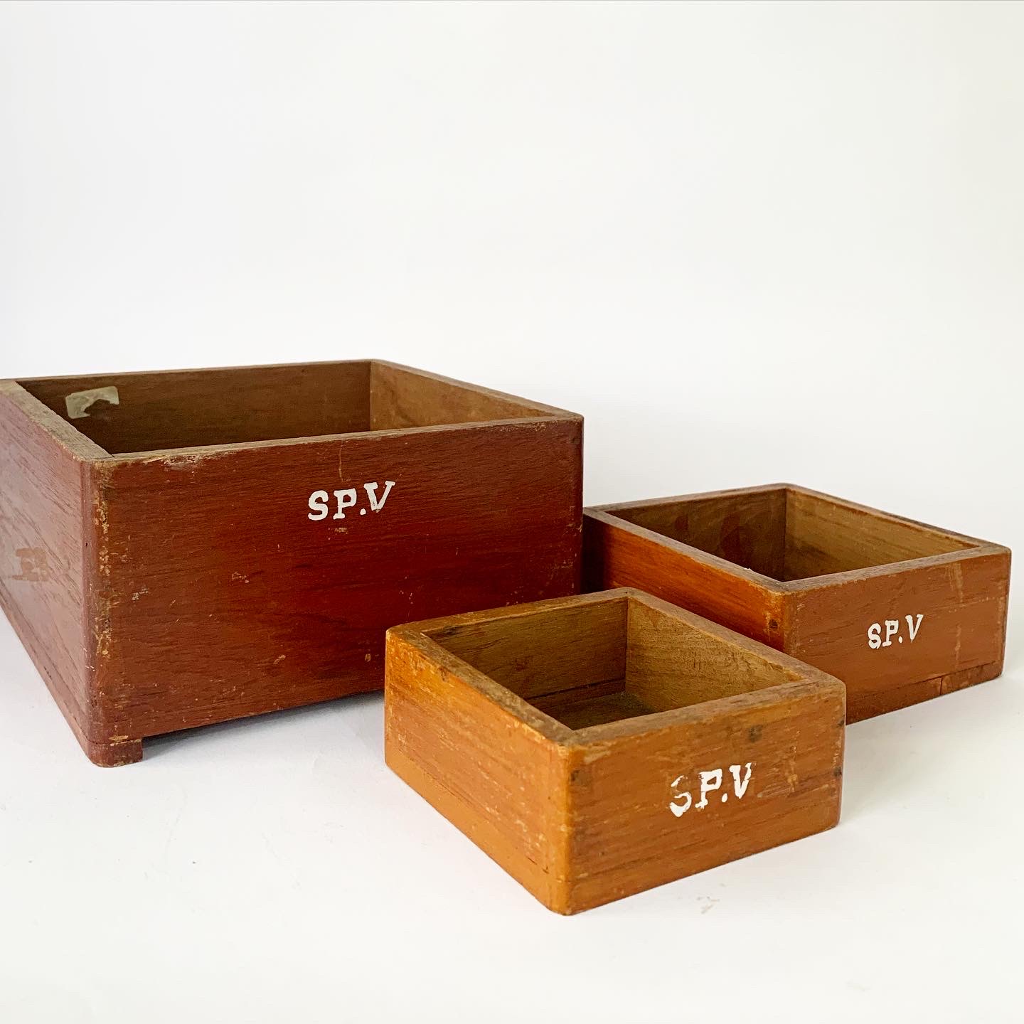 This trio of sturdy useful teak open boxes come from the Chettinad region in Tamil Nadu, South India. The three boxes date back to the 1930s/40s and work wonderfully as a set. Each has the owner’s initials hand painted on the side of front of the box.