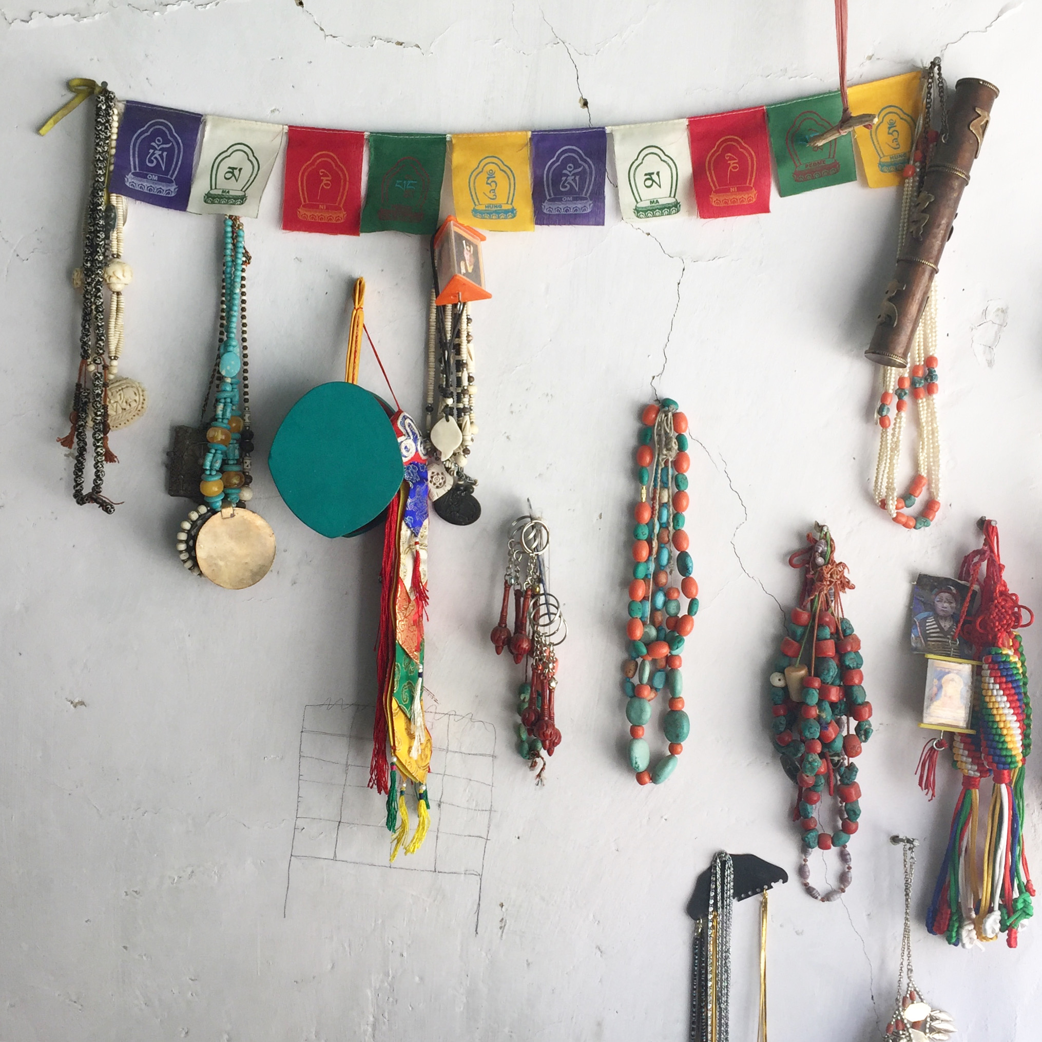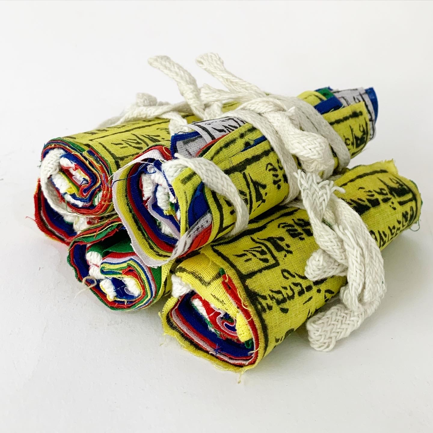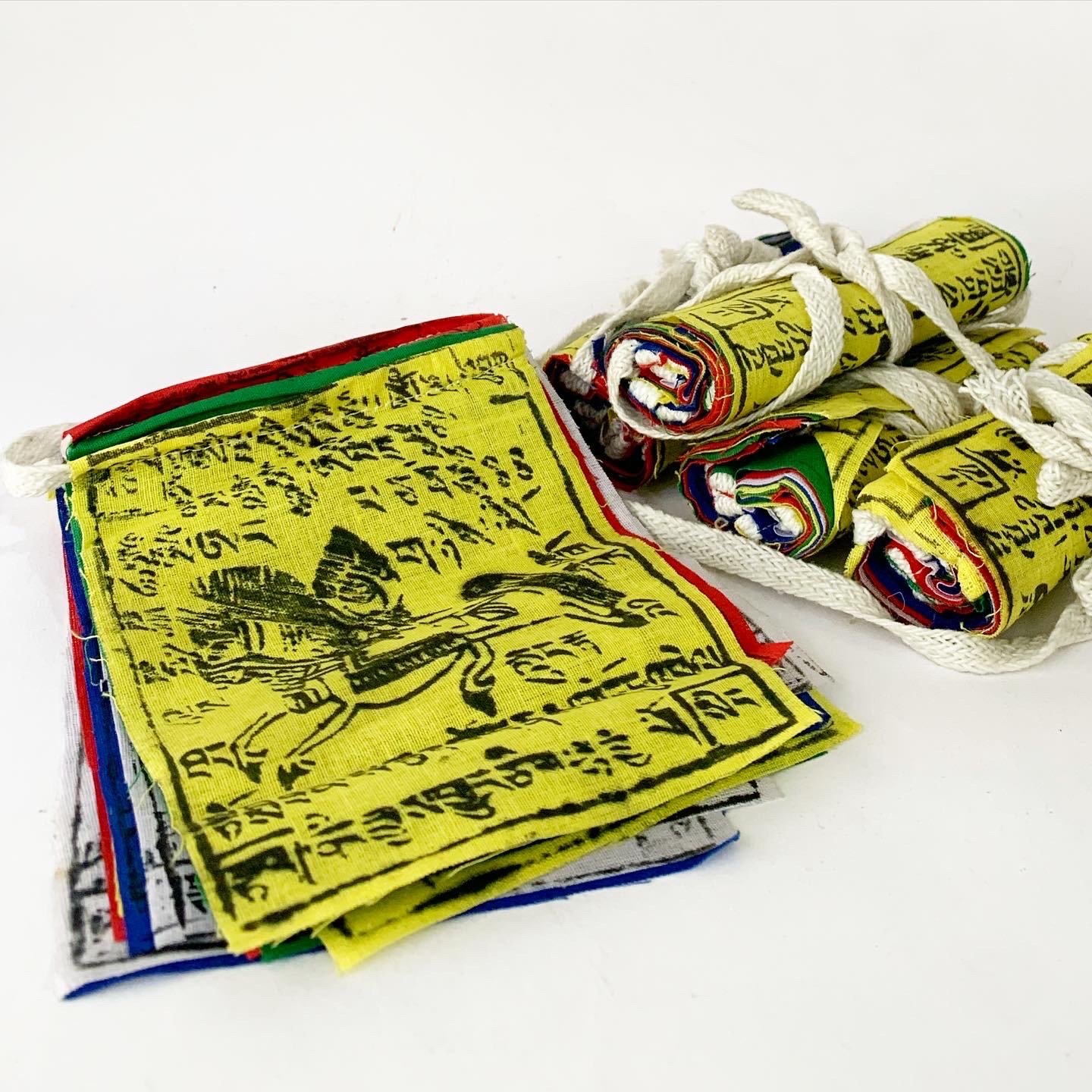 Payer flags are ubiquitous throughout the Himalaya. The coloured flags are hand block printed with prayers, mantras and images of deities. Buddhists believe that the prayers are carried by the wind and spread goodwill and positive energy. This set of flags was hand-made by artisans in the Dekyling Tibetan community located near the city of Dehradun, Uttarakhand in the foothills of the Indian Himalaya. These flags have prayers surrounding a central image of lungta, a Windhorse. Lungta is also the Tibetan word for 'prayer flag'.