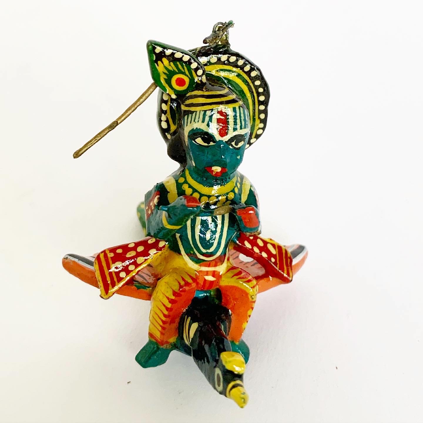 This delightful Krishna, which is in pristine condition, was hand-carved and hand-painted in Varanasi, in the central state of Uttar Pradesh. Krishna, the god of protection, compassion, tenderness, and love, is one of the most revered Indian deities. Krishna’s various life stages are all celebrated; a god child, a practical joker when working as a cowherd, a prolific and accomplished lover, a divine hero and then finally a supreme being. His teachings are revealed in the Bhagavad Gita, which is the most widely translated and read Hindu scripture in the world. Krishna’s characteristics are that he is often depicted as blue in colour and has a flute in his hand as can be seen here. This piece comes with a hook ready to hang.