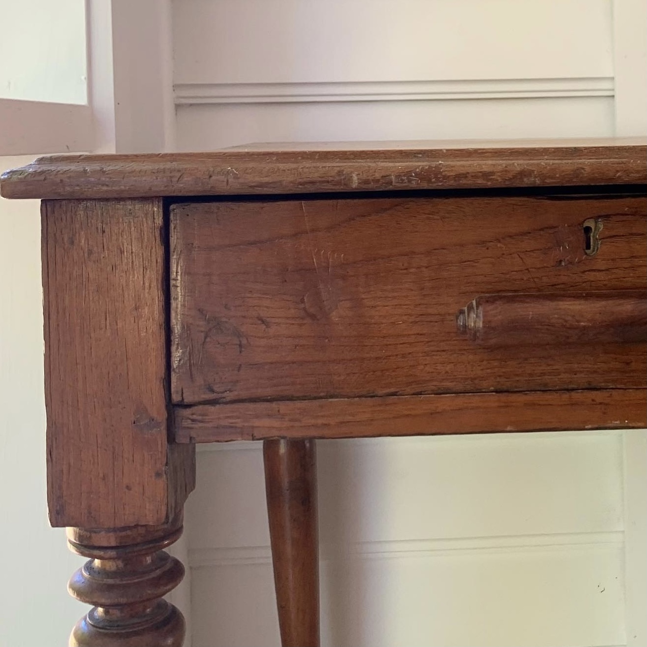This Victorian style writing desk from South India dates back to the 1930s. Made from Burmese teak, the desk has particularly nice turned wooden drawer handles. Both drawers are fitted with new working locks (keys provided). Teak wood is renowned for unsurpassed durability and Burmese teak sourced from the forests in Myanmar (Burma) is the most sought-after variety. The properties of teak vary depending on the environmental growing conditions, and for centuries Burmese teak has been the first choice for fine furniture. The higher oil content is the key to longevity and the rich golden colour deepens with age.